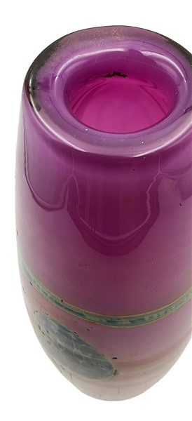 Vaso in vetro incamiciato glicine opaco e incolore decorato con applicazioni informali policrome nei toni del giallo e blu. Francia, seconda metà secolo XX. Firmato a punta sotto la base. (h cm 34,5)
