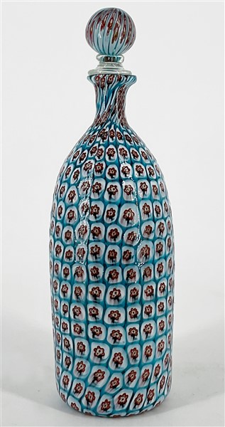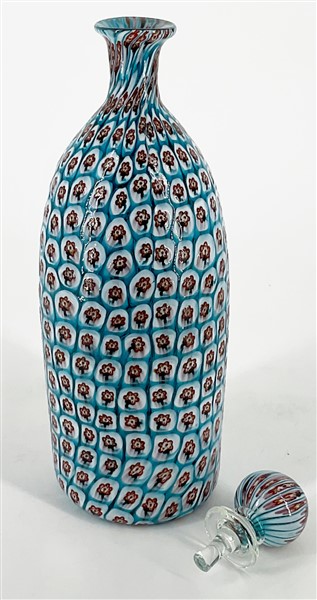 Bottiglia con tappo in vetro soffiato a murrine celeste trasparente e lattimo, decorate con fiore in vetro rosso, giallo e bruno. Seconda metà secolo XX. (h cm 28,5) (lievi difetti)