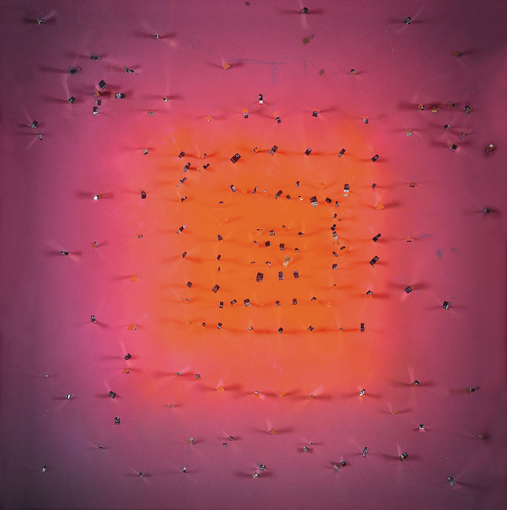 luci riflex e acrilici su faesite cm. 90x90, firma, titolo, anno e timbro della Galleria Giò Arte (Mestre-VE) al retro, dichiarazione d'autenticità e timbro dell'artista su foto.
