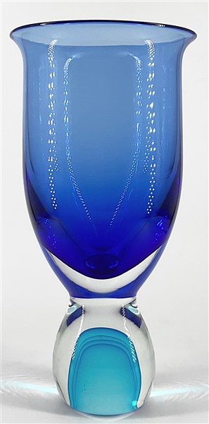 Vaso a coppa in vetro sommerso incolore, blu e celeste. Murano, seconda metà secolo XX. (h cm 35)