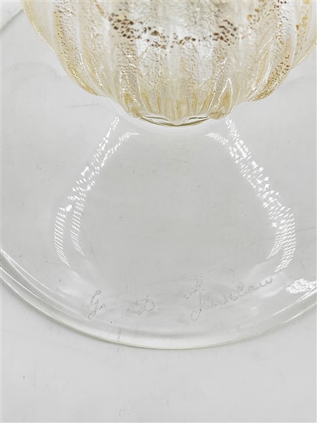 Vaso a calice in vetro incolore con applicazione di foglia d'oro. Seconda metà secolo XX. Firmato a punta G. D. Furlan. (h cm 38) (difetti e restauri)