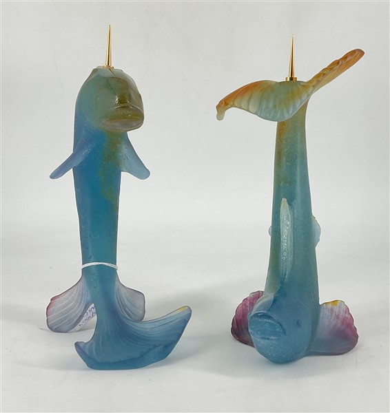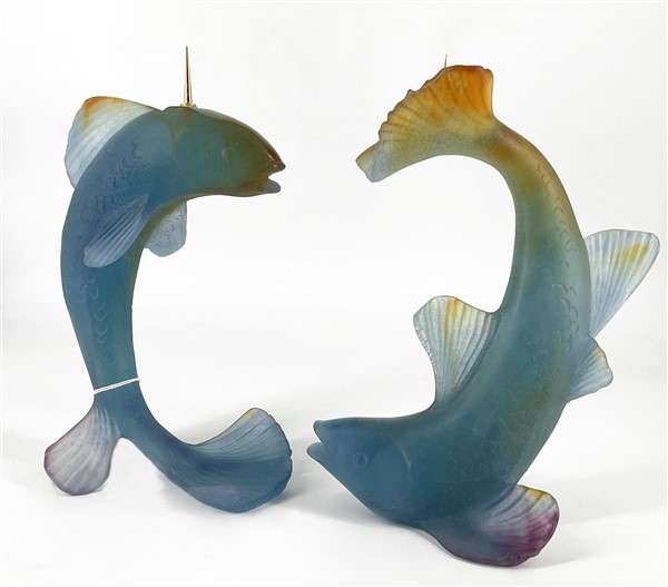 Daum Coppia di candelieri in pasta vitrea a forma di pesci. Nancy, seconda metà