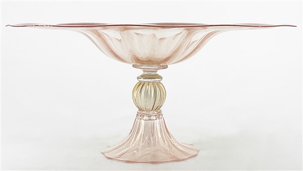 Alzatina costolata in vetro soffiato incolore con applicazioni di foglia d'oro. Seconda metà secolo XX. (d cm 35)