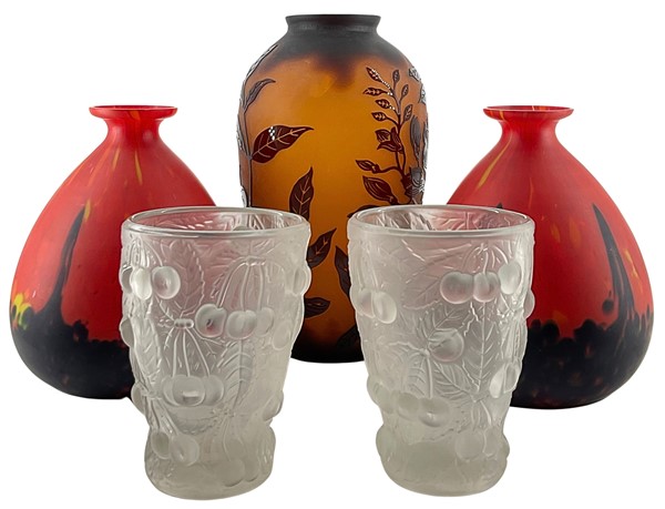 Lotto di cinque vasi in vetro di decori e colori differenti imitanti le tecniche e lorme dei vetri Art Noveau francesi. Seconda metà secolo XX. (h max cm 25)