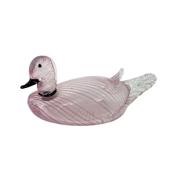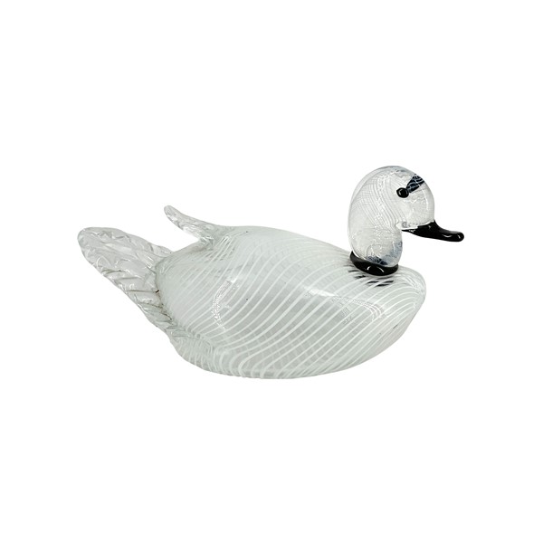 Lotto composto da quattro papere in vetro soffiato incolore e nero a mezza filigrana lattimo e rosa. Seconda metà secolo XX. (l max cm 37, h max cm 18) (difetti e mancanze)