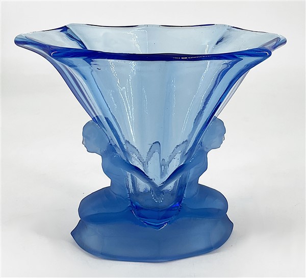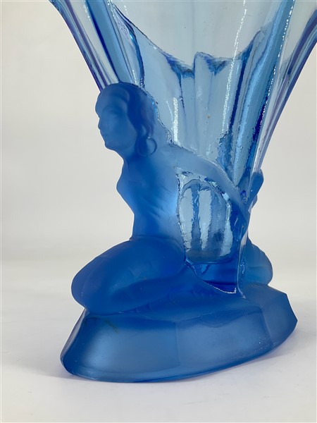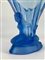 Vaso in vetro azzurro trasparente soffiato in stampo, decorato con figure femminili inginocchiate. Seconda metà secolo XX. (h cm 16)
