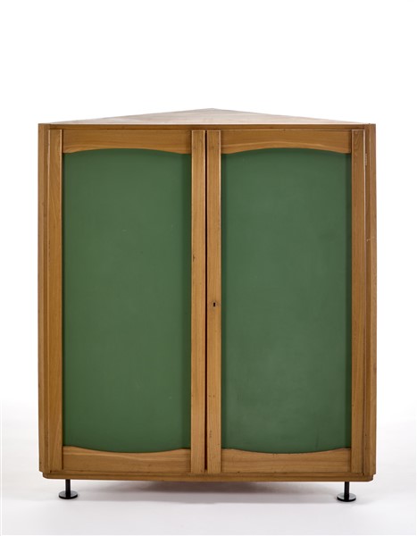 Mobile contenitore angolare a due ante. Novara, anni '60. Legno massello e impiallacciato, pannelli rivestiti in panno verde. (cm 141x154x82) (lievi difetti)