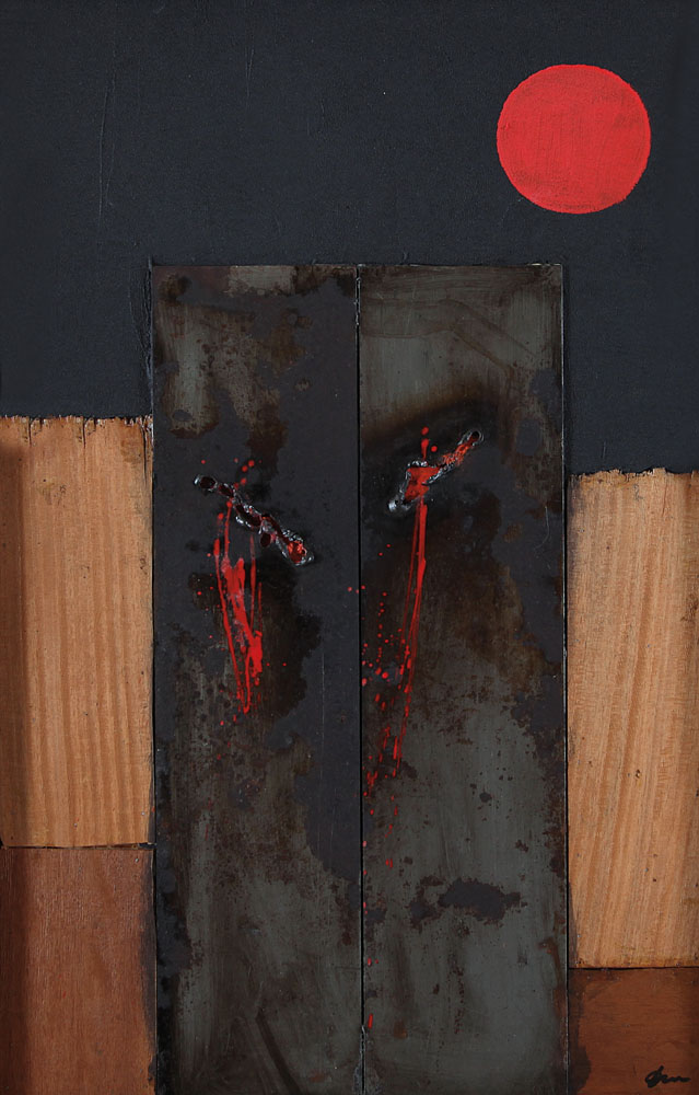 olio, tecnica mista, applicazioni in legno e metallo, combustioni su tavola cm. 80x50, firma in basso a destra, titolo, firma e archivio dell'artista n° 0483OSTM al retro, dichiarazione d'autenticità e archivio dell'artista su foto.