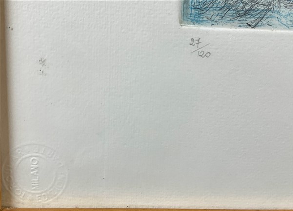 firmata e numerata 27/120 in basso a matita, timbro a secco Torcular Edizioni d'Arte, Milano in basso a sinistra. In cornice (lievi difetti)