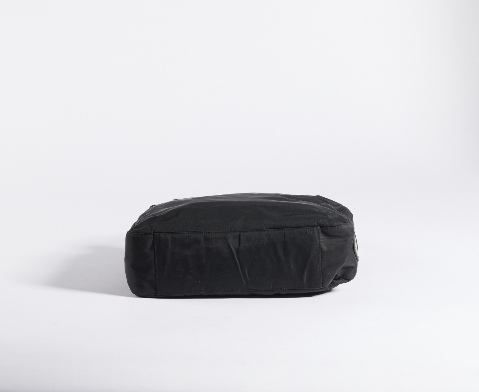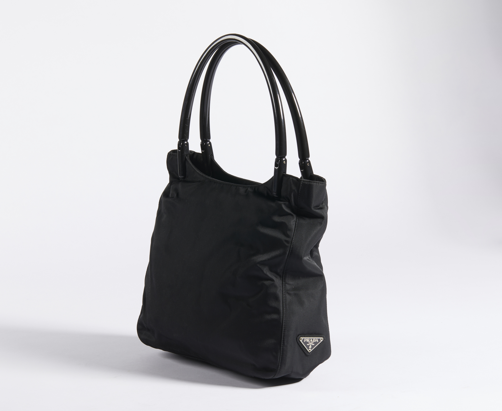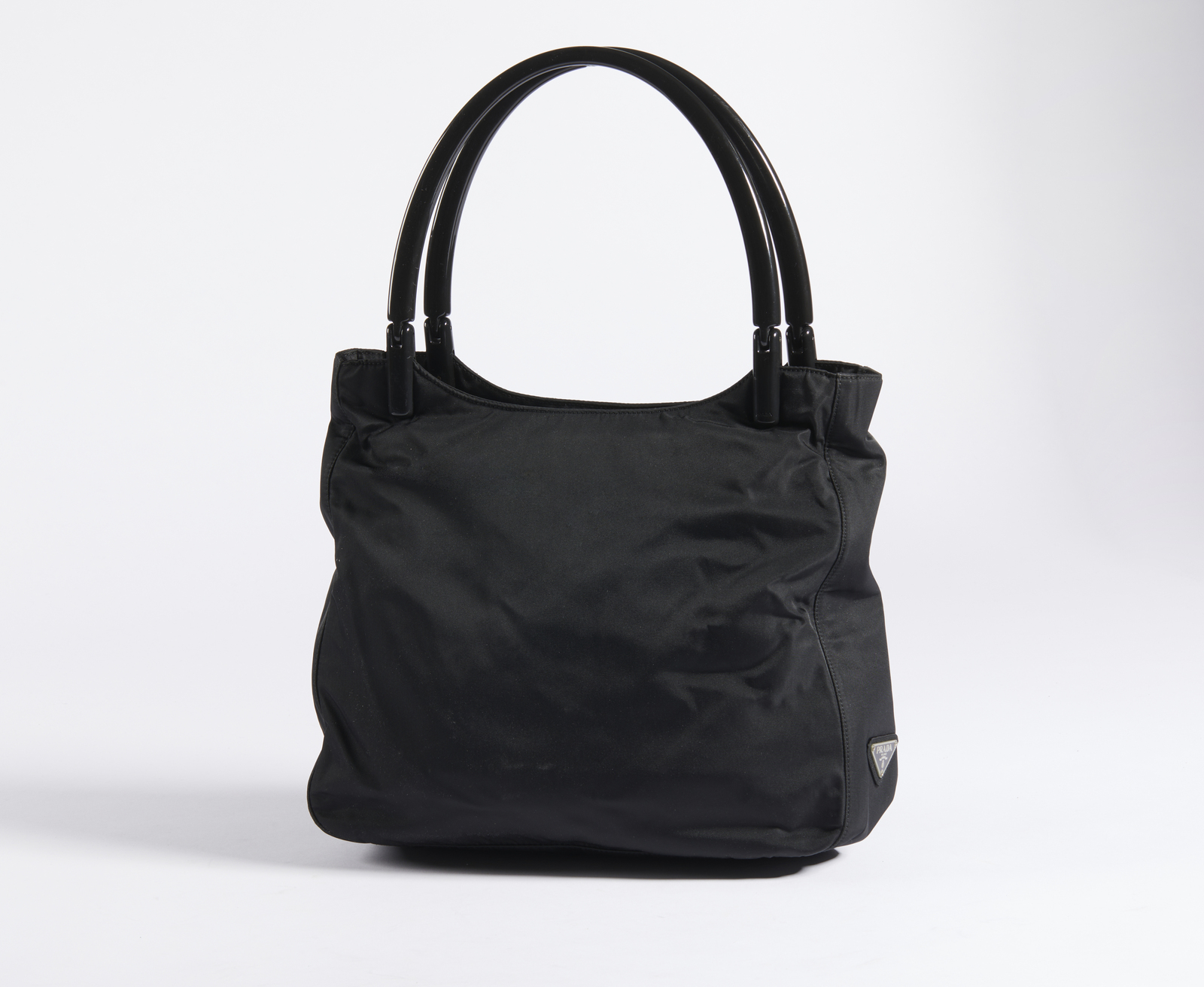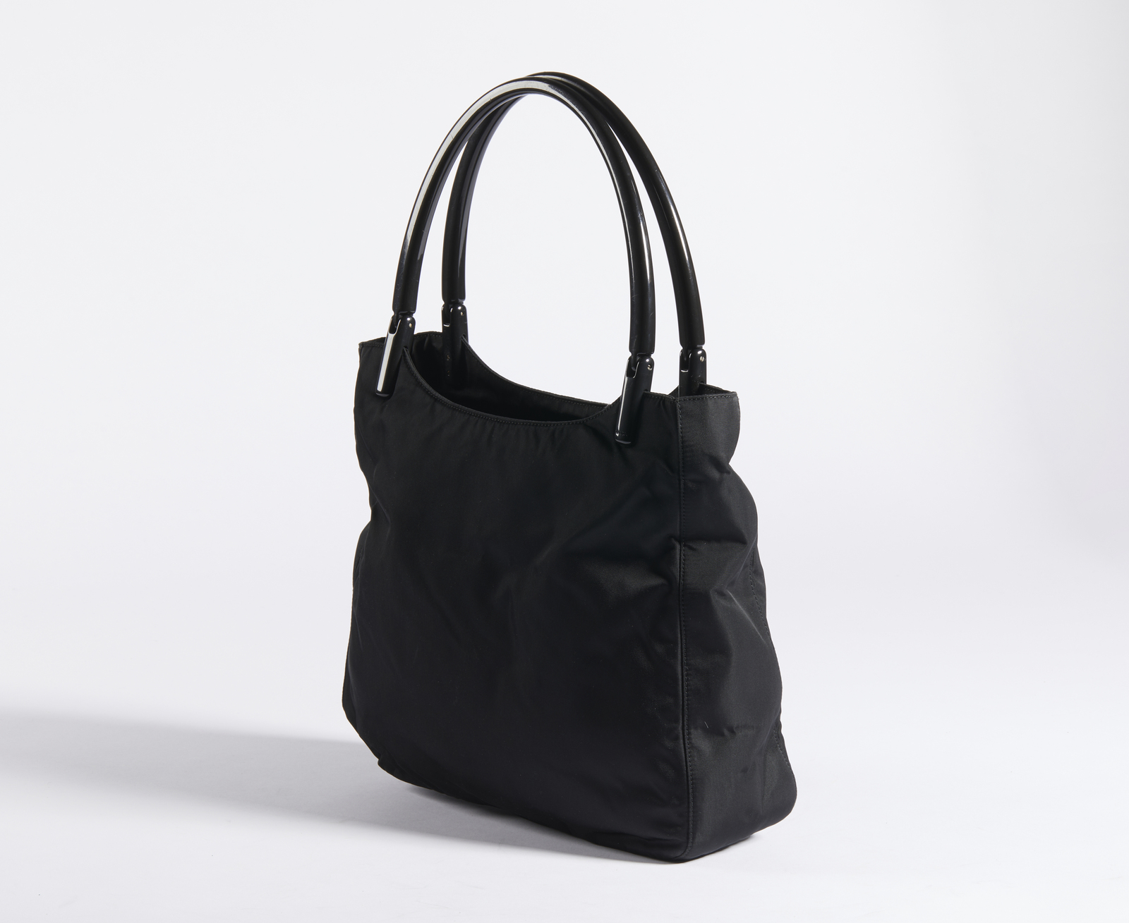 PRADA MILANO Borsa in tessuto nero. Tessuto. Cm 32,00 x 26,00 x 10,00. Borsa in tessuto tecnico nero con logo sul fianco. Manici in plastica. Tessuto interno con logo Prada. Internamente due tasche interne una con zip, la seconda con calamita.