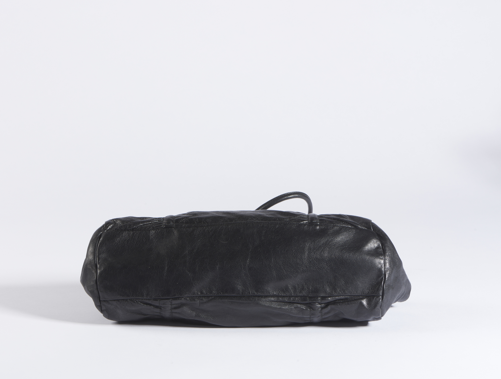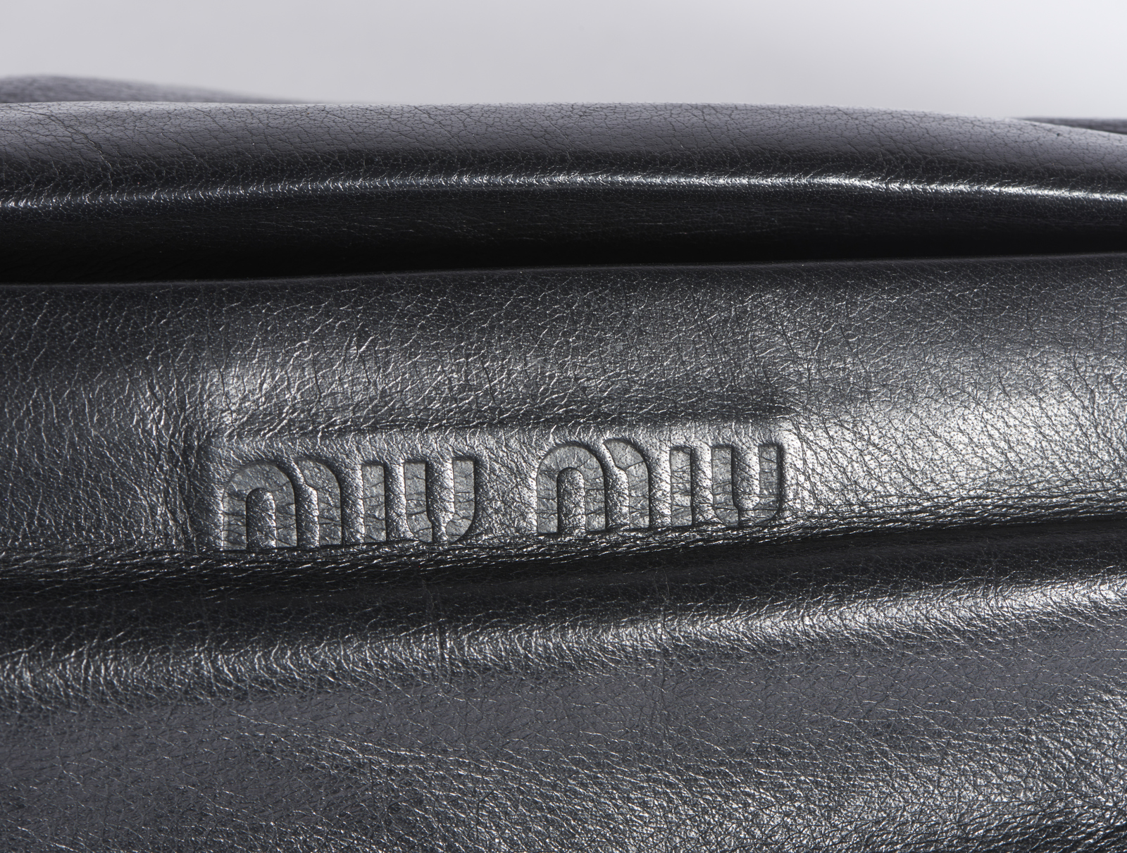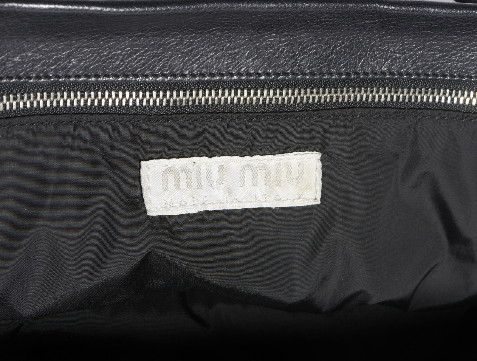 MIU MIU Borsa a mano nera. Pelle. Cm 37,00 x 19,00 x 12,00. Borsa a mano con logo al fronte impresso. Interno foderata in Nylon con logo. Una taschina porta carte all'interno. Chiusura con bottoni. Lunghezza dei manici 22cm.