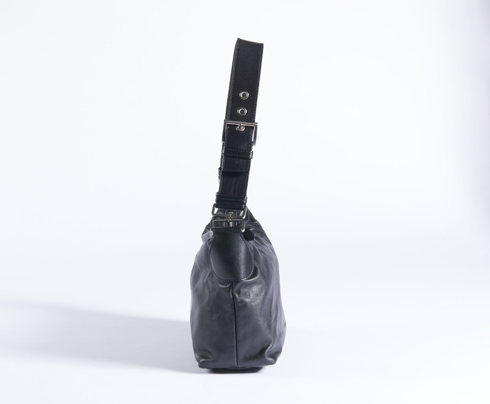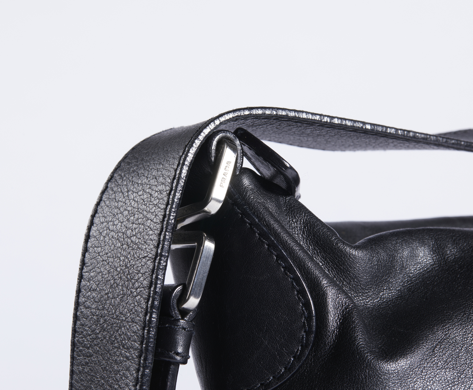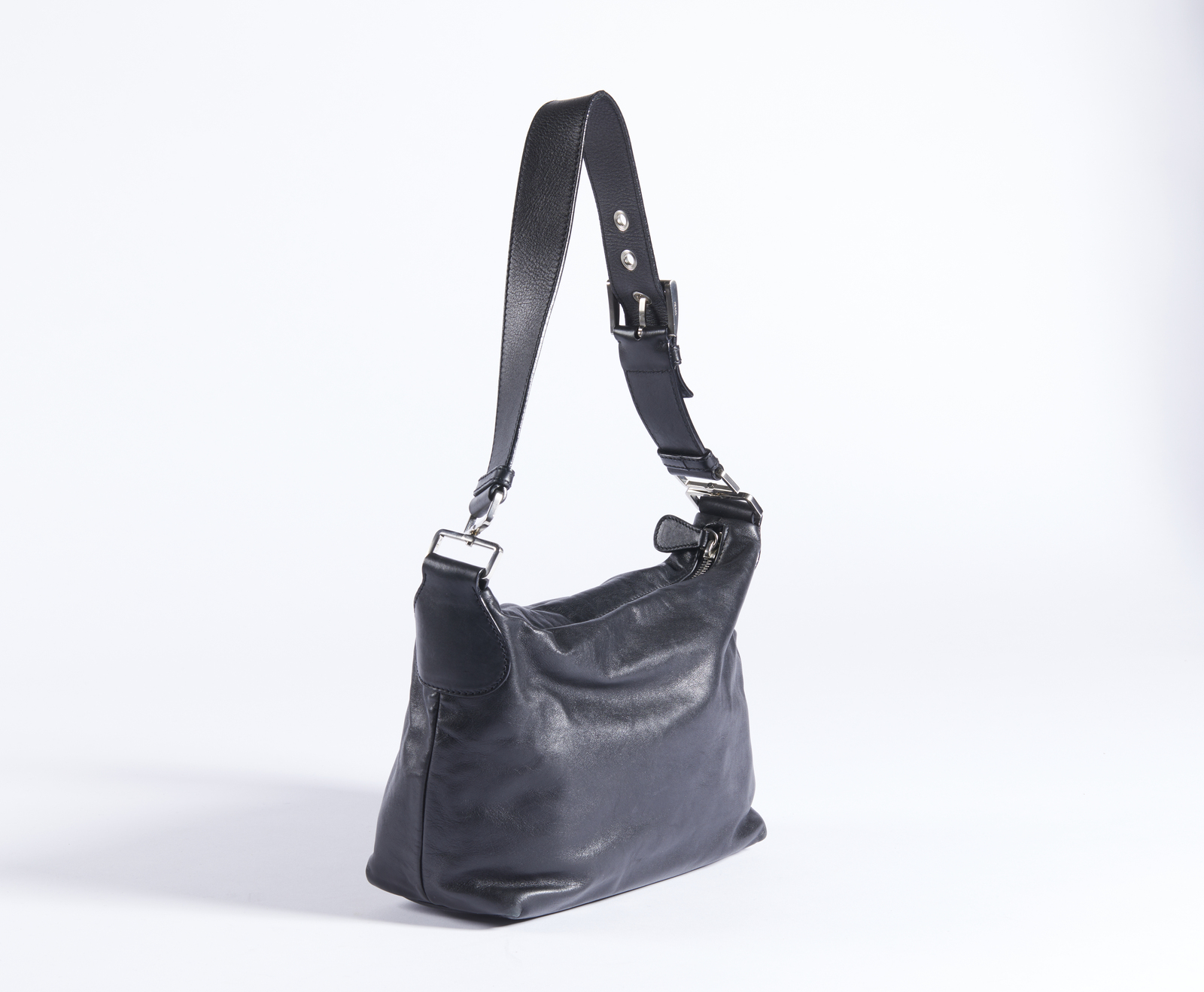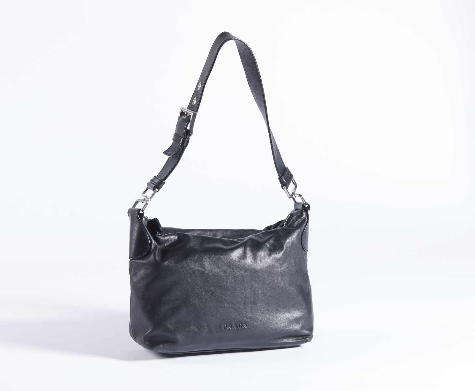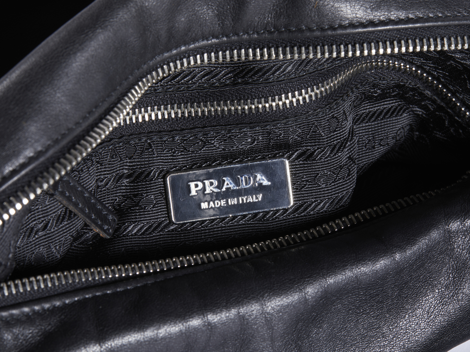 PRADA MILANO Borsa in pelle nera . Pelle. Cm 26,00 x 18,00 x 10,00. Borsa a spalla in pelle nera di vitello. Chiusura con zip. Hardware in metallo color argento. Interno in tessuto Prada con tasca porta oggetti, chiusura con zip. Logo in rilievo sulla pelle esterna, mentre internamente il logo è in metallo.