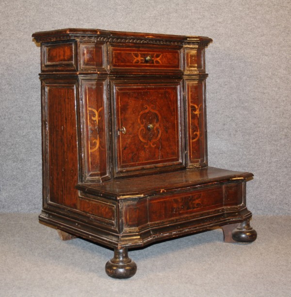 Firmato, datato. Inginocchiatoio in legno di noce con inserti di radica intarsiata. Inizi XVIII secolo. Mis. Lung. cm. 75 Alt. cm. 84 Prof. cm. 53 ca.