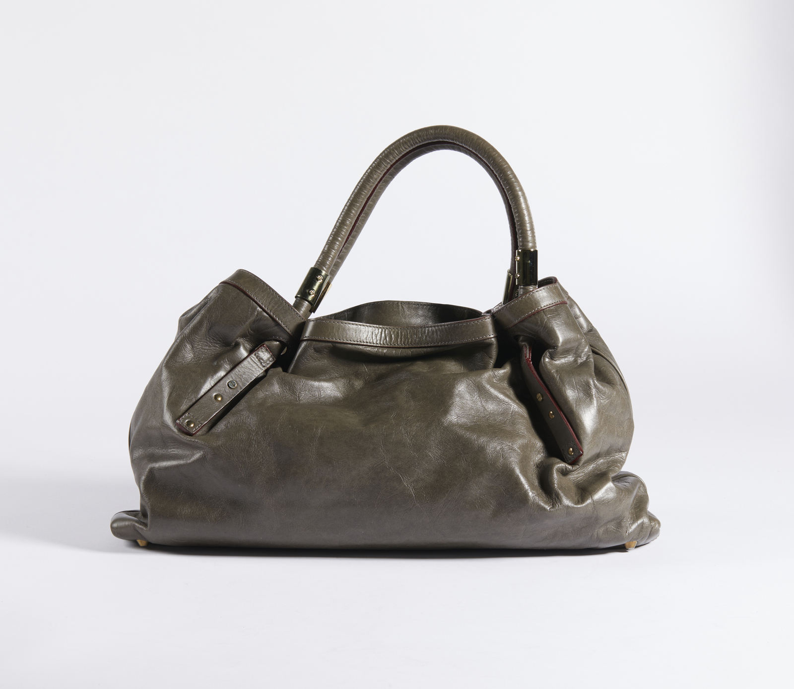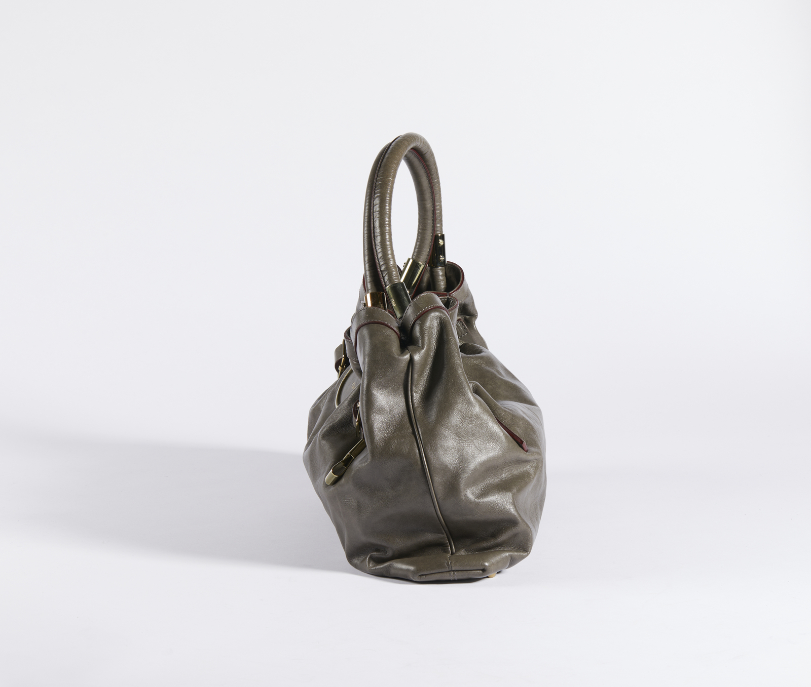 CHLOE' Borsa in pelle grigia. Pelle. Cm 49,00 x 30,00 x 8,00. Borsa di pelle grigia con due manici. Hardware dorato e bordi bordeaux. Interno in tessuto bordeaux con tasca a scomparsa. Logo esterno.