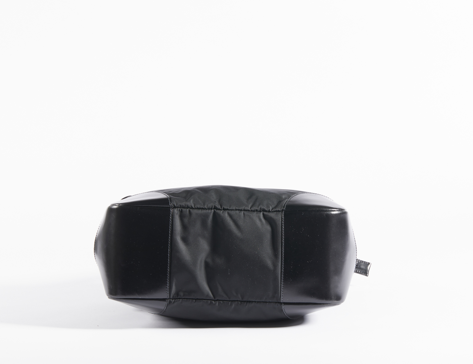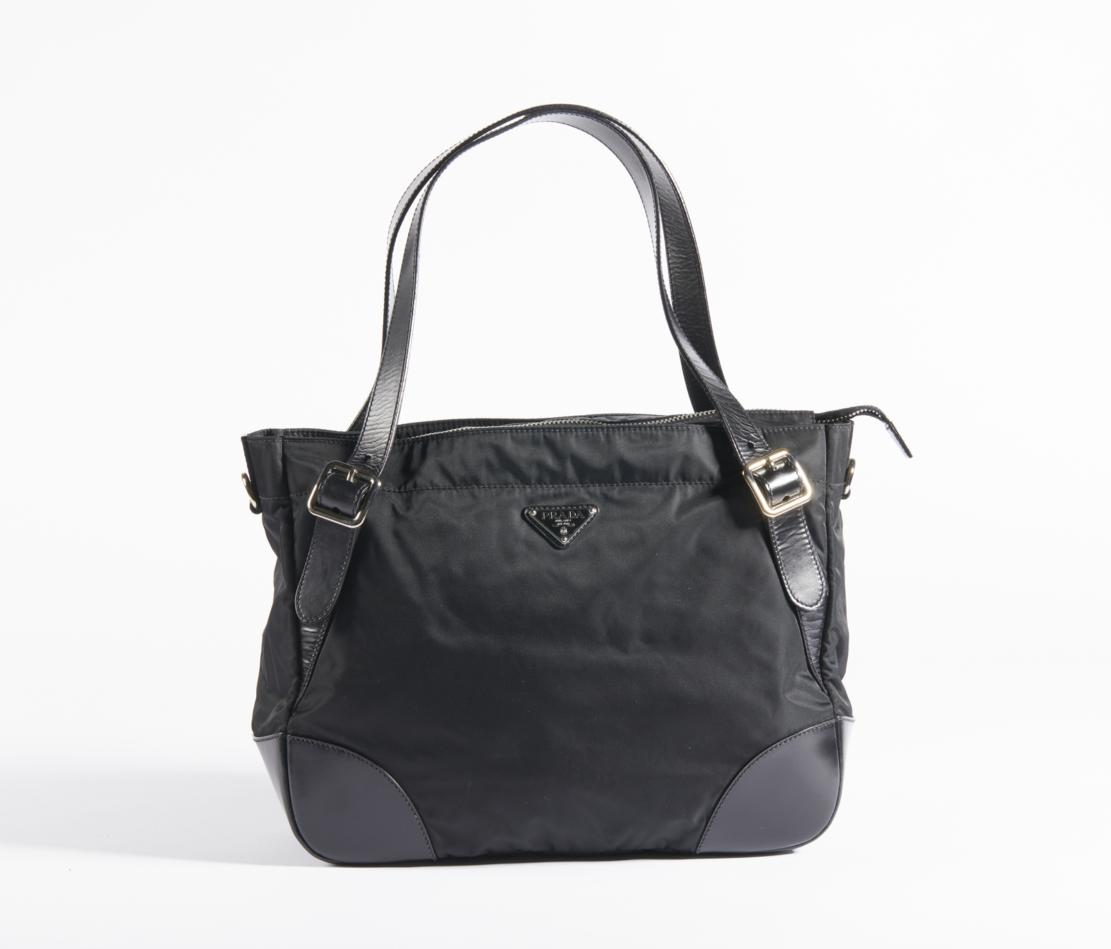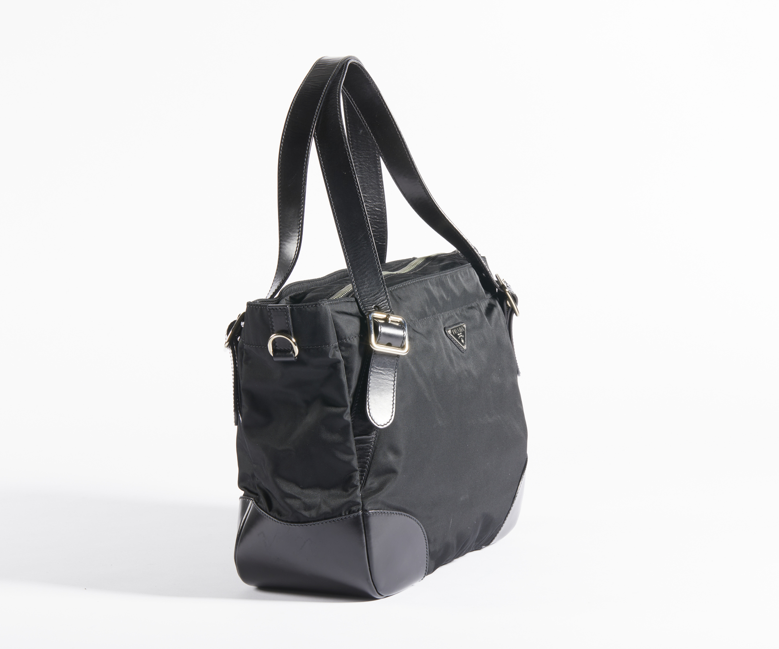 PRADA MILANO Borsa nera a spalla. . Cm 35,00 x 27,00 x 14,00. Borsa in tessuto tecnico nero con logo Prada. Inserti in pelle nera e hardware color argento. Chiusura con zip. Interno con logo Prada e due grandi tasche interne con chiusura a zip.
