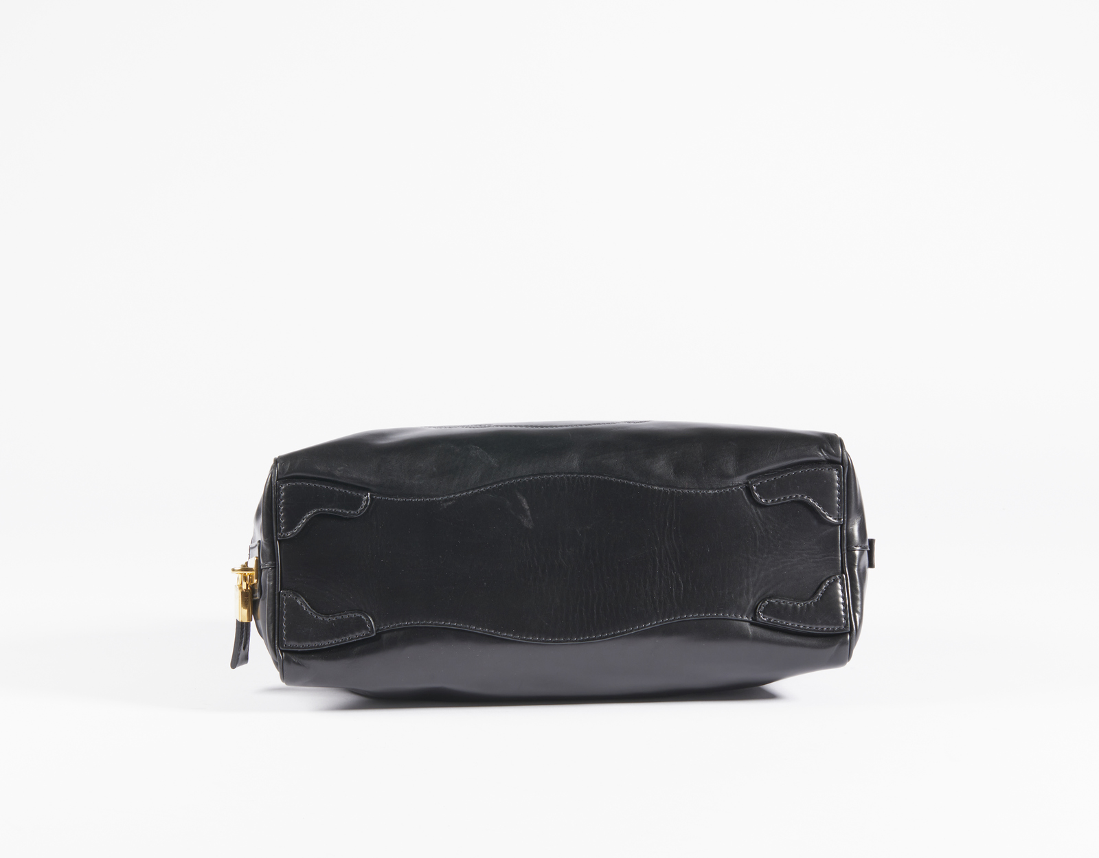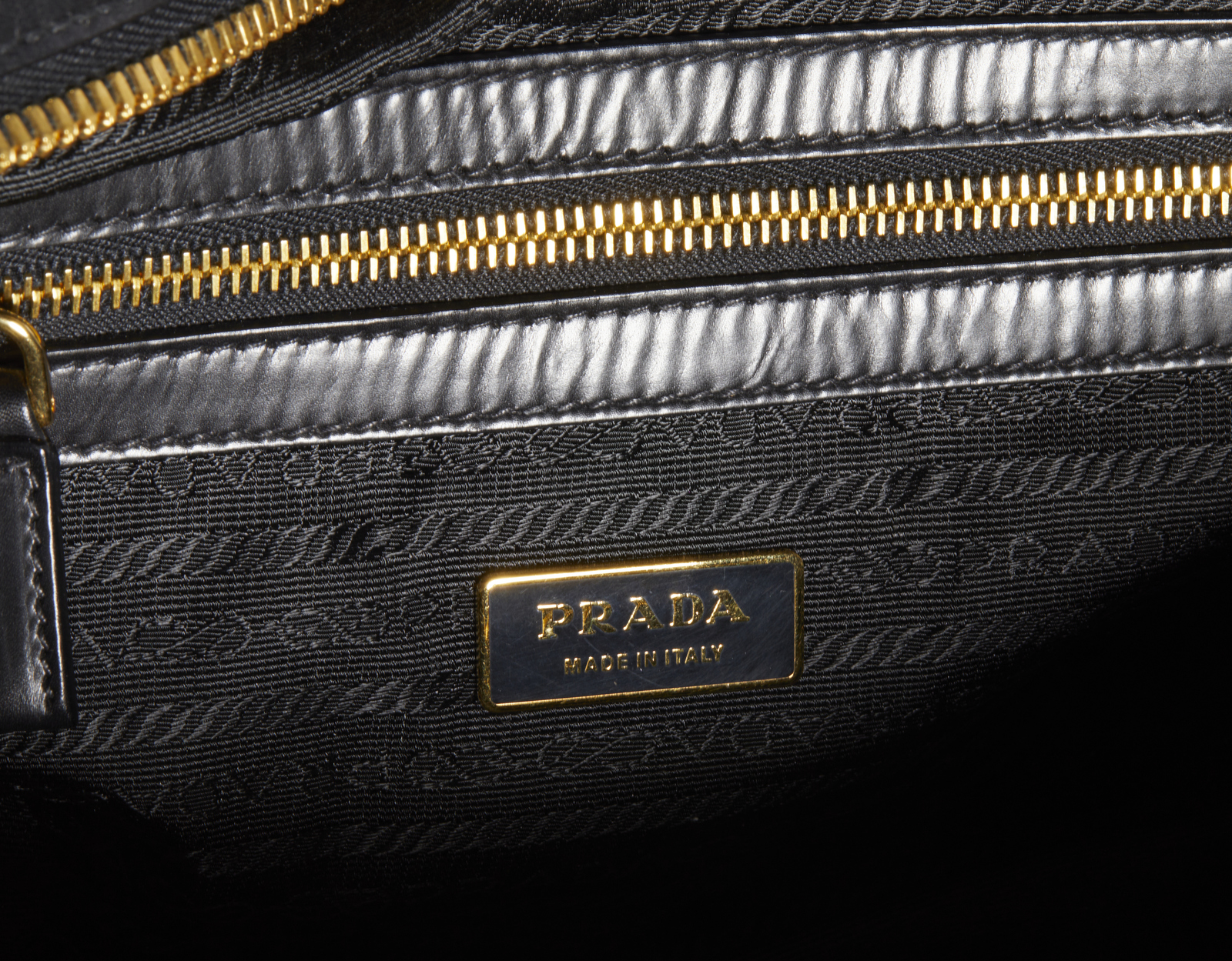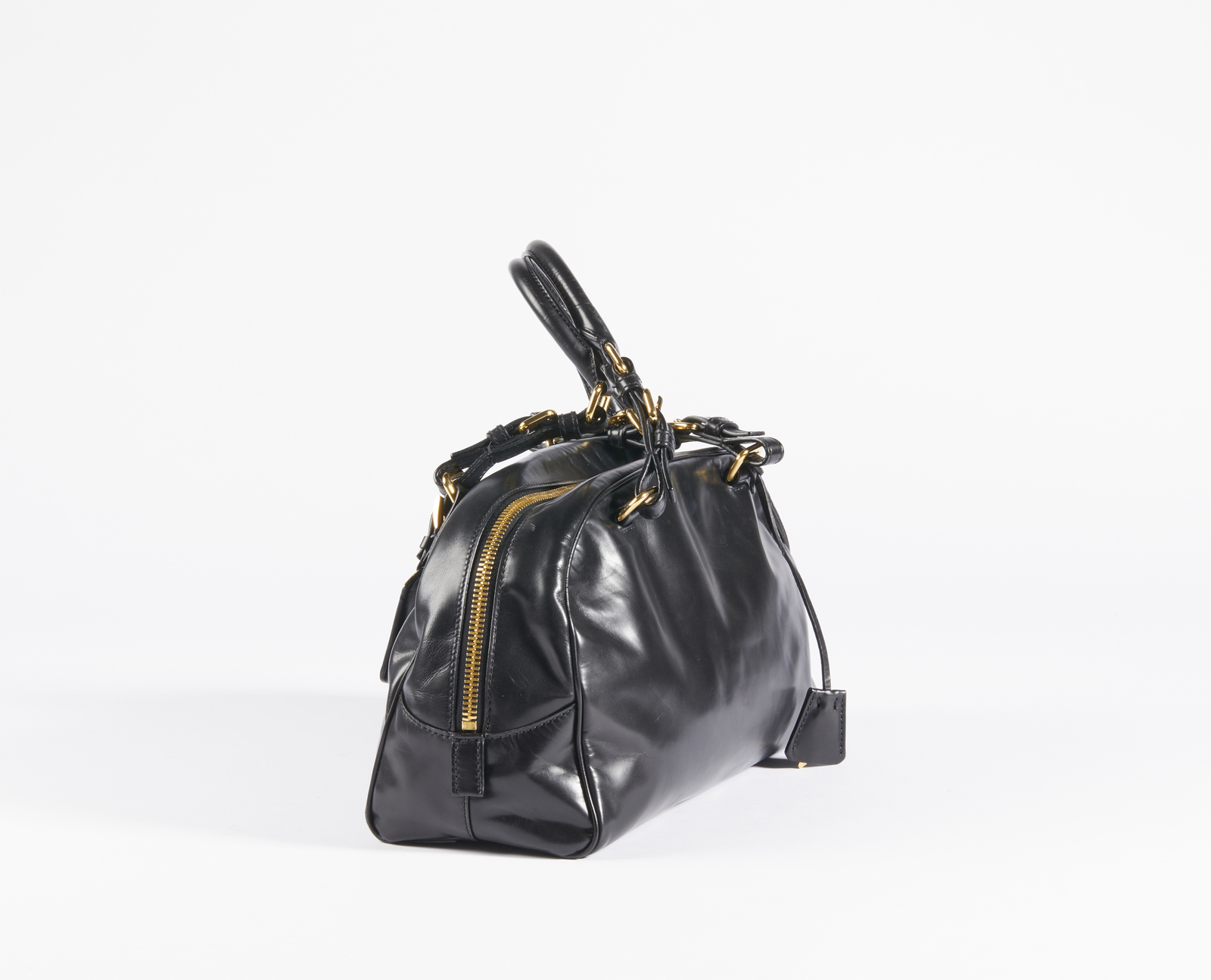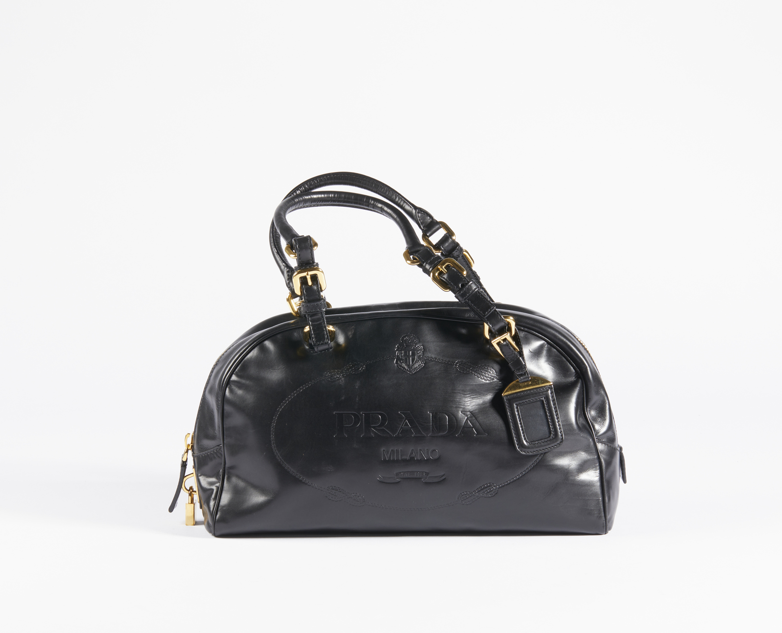 PRADA MILANO Borsa in pelle nera. Pelle. Cm 34,50 x 22,00 x 13,00. Borsa di pelle nera a spella. Hardware color oro. Manici in pelle e logo Prada in rilievo sul fronte. Chiusura con zip. Lucchetto e chiavi con hardware color oro. Interno in tessuto tecnico Prada con tasca con zip e logo.