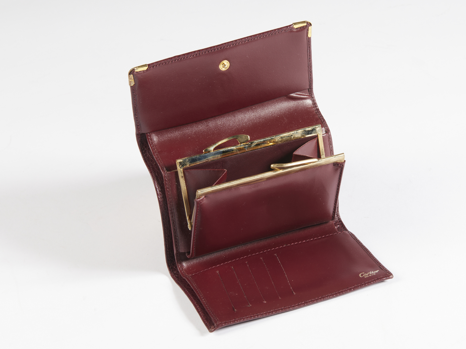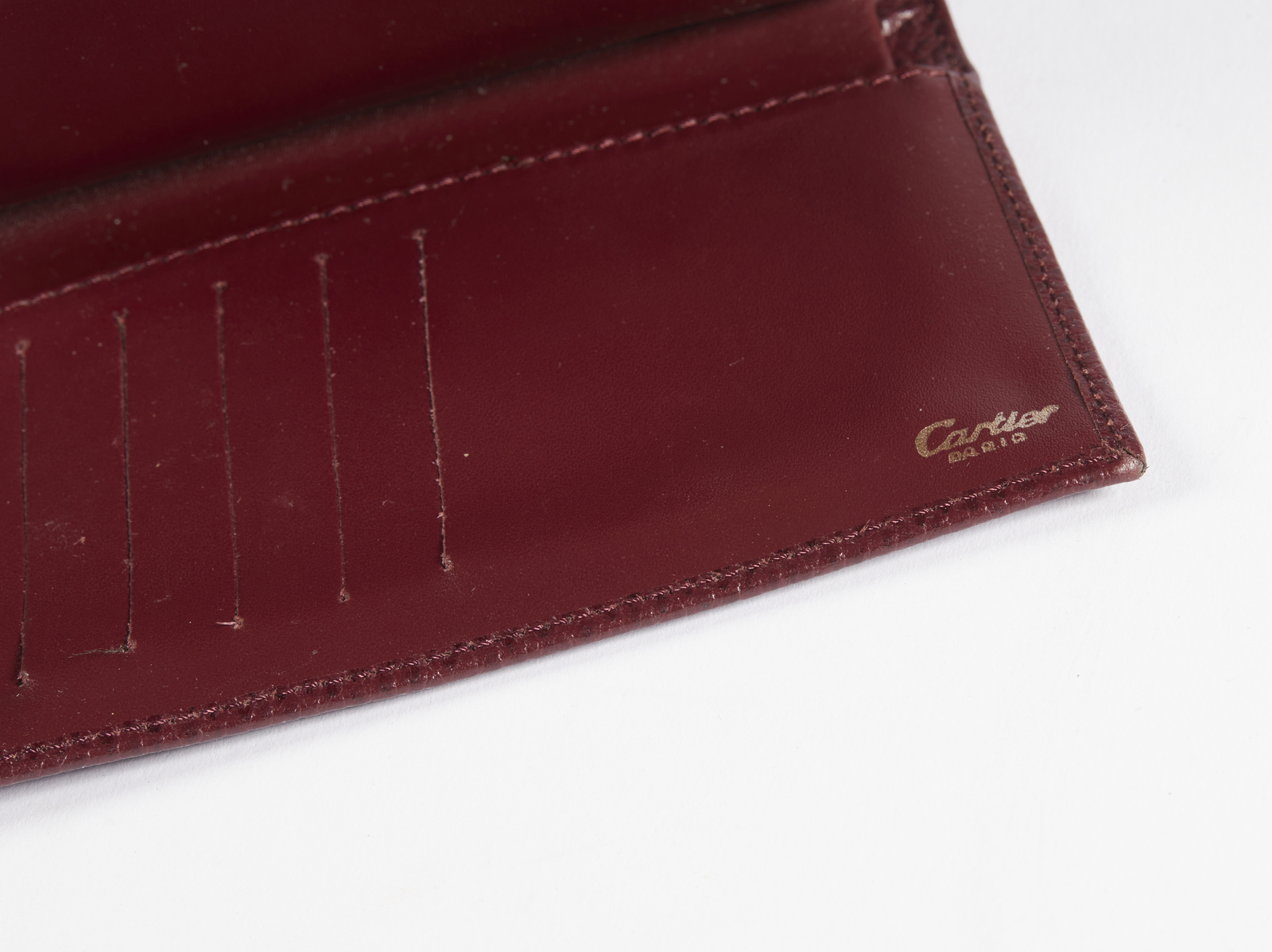 CARTIER Portafoglio bordeaux. Pelle. Cm 15,00 x 10,00. Portafoglio Cartier vintage in pelle bordeaux martellata, dettagli dorati hardware agli angoli della patta a chiusura con bottone a pressione, logo Cartier impresso al fronte. All'interno, una tasca aperta per le banconote, una tasca con aperture porta carte, un borsellino per le monete con chiusura a scatto in hardware dorato, logo Cartier in caratteri dorati all'interno.
