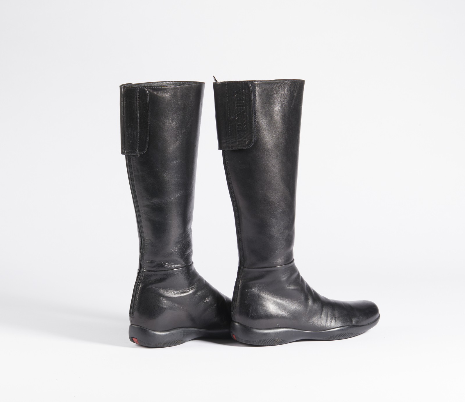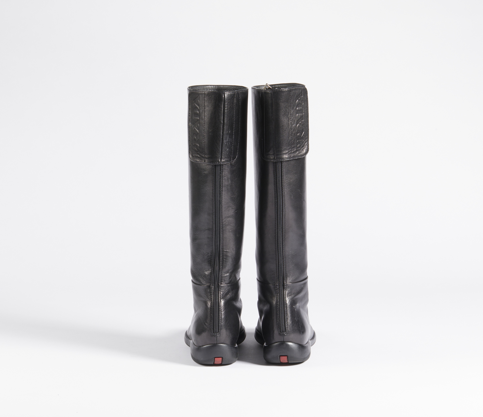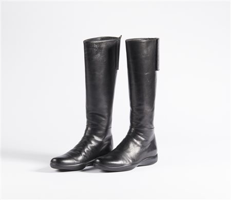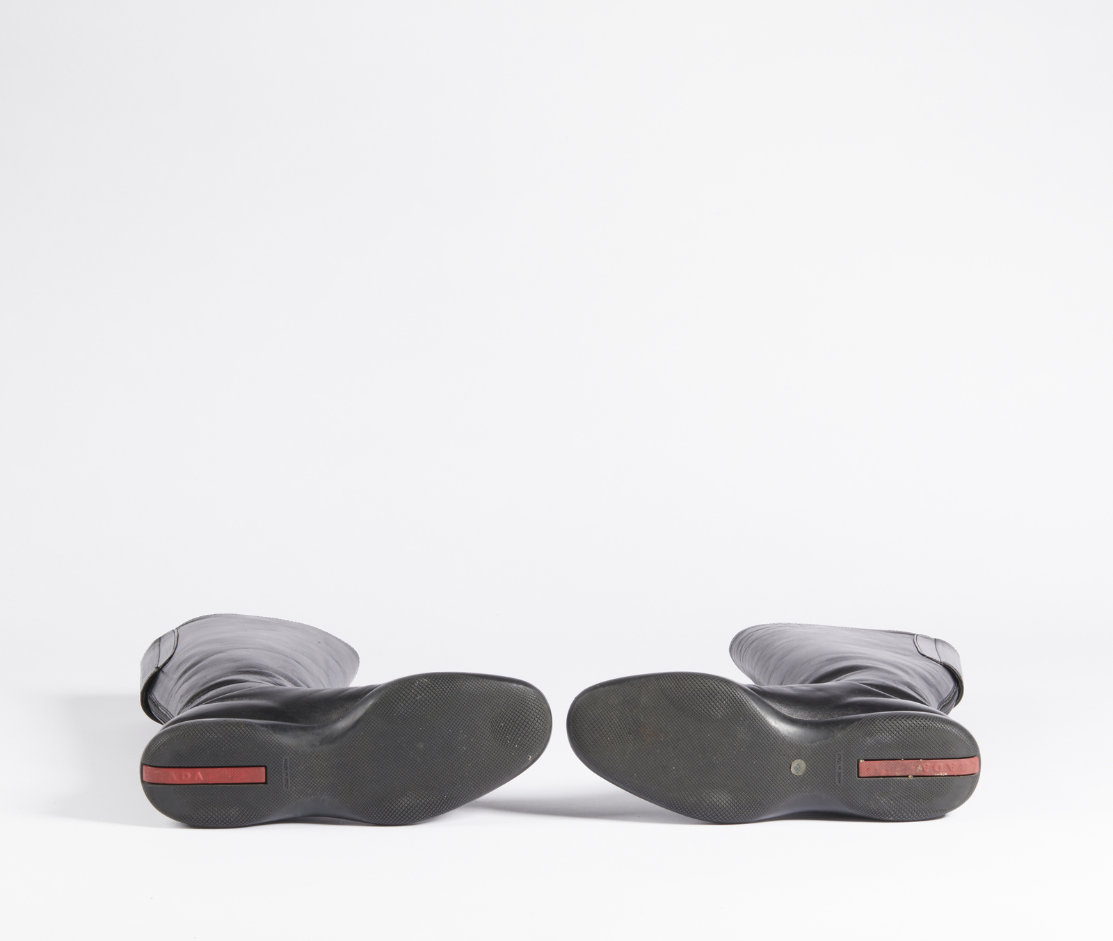 PRADA MILANO Stivali in pelle nera. Pelle. Cm 25,50 x 36,90. Stivali neri di pelle. Suola in gomma con logo rosso Prada, altezza del tacco 2 cm, chiusura al retro con zip e fascia a strappo Prada. Numero 36 1/2