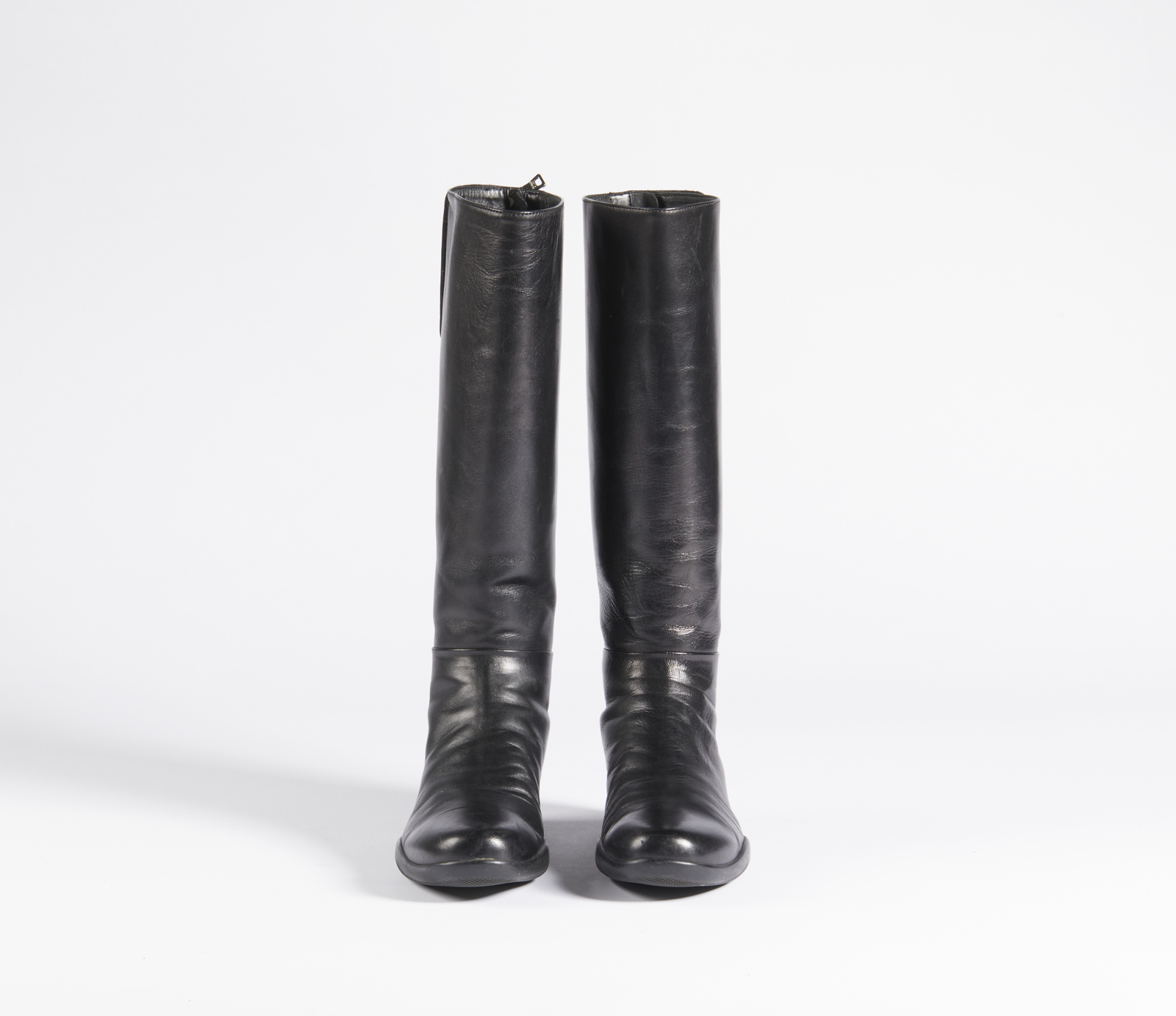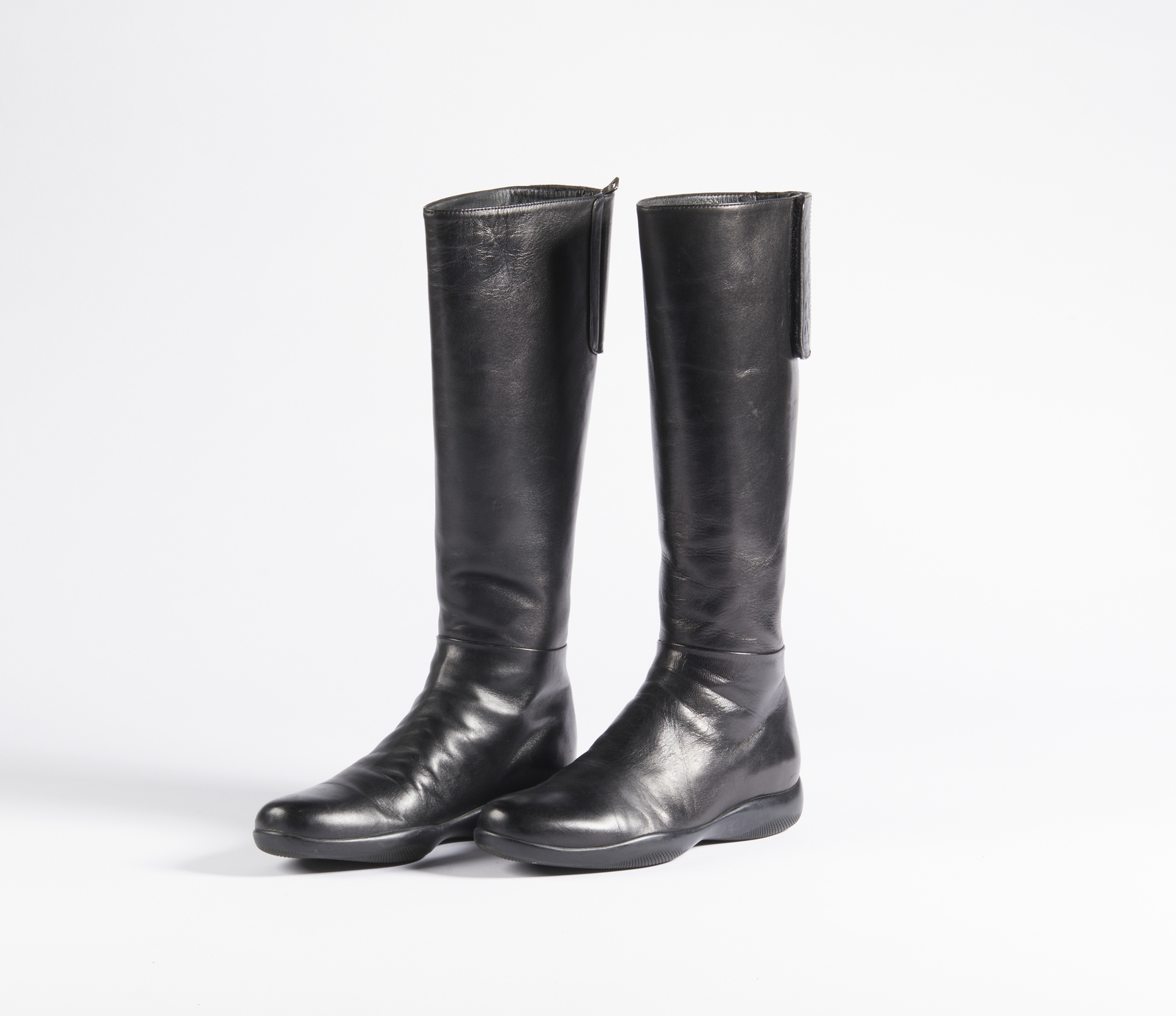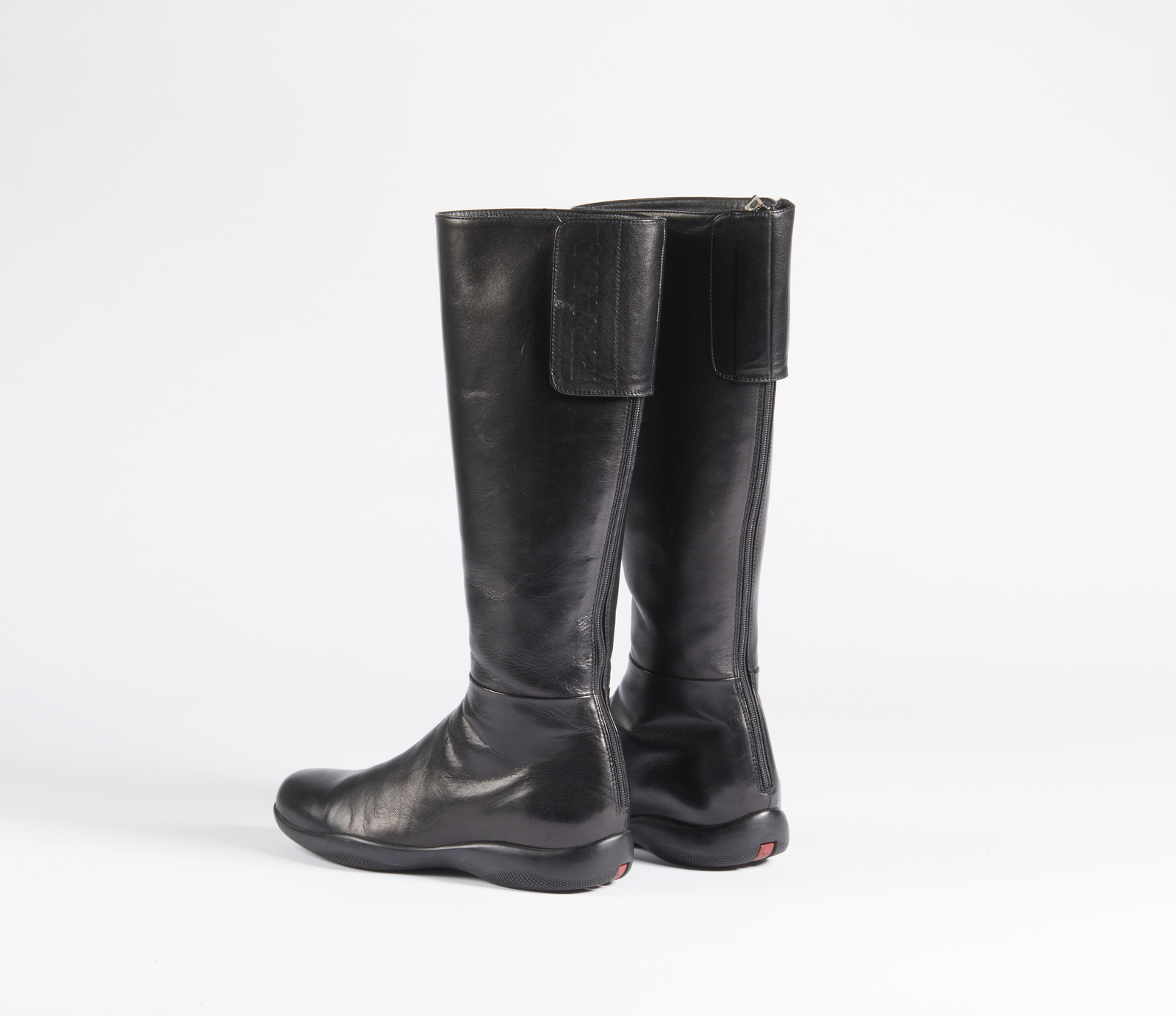 PRADA MILANO Stivali in pelle nera. Pelle. Cm 25,50 x 36,90. Stivali neri di pelle. Suola in gomma con logo rosso Prada, altezza del tacco 2 cm, chiusura al retro con zip e fascia a strappo Prada. Numero 36 1/2