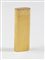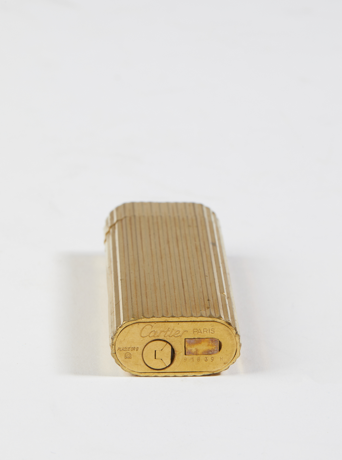 CARTIER Accendino placcato oro. Metallo dorato.. Cm 2,80 x 7,00. Accendino da tasca Cartier in metallo placcato oro, forma rettangolare, rigato, firma incisa alla base.