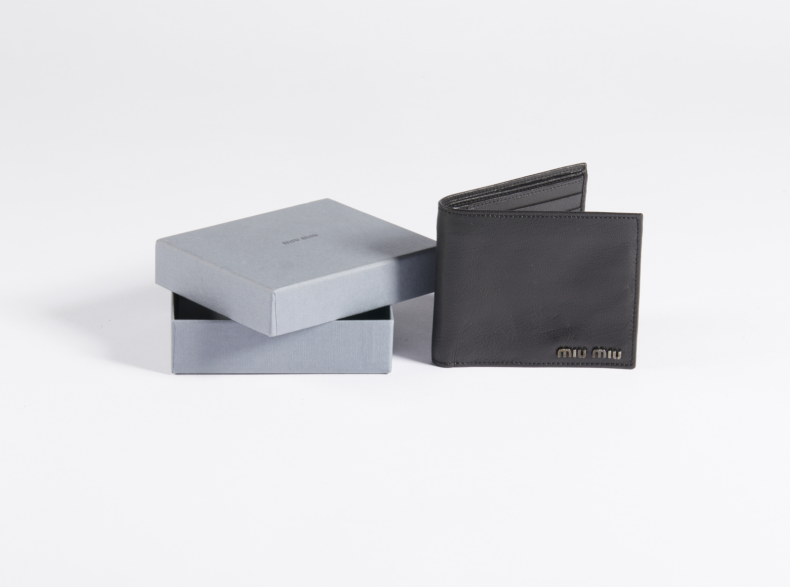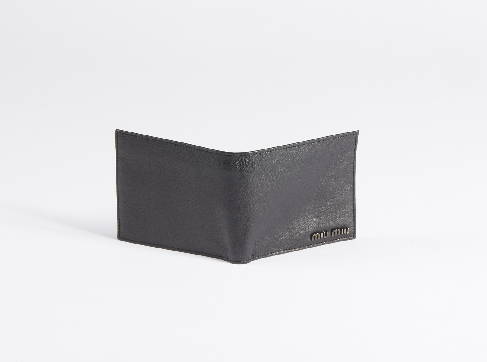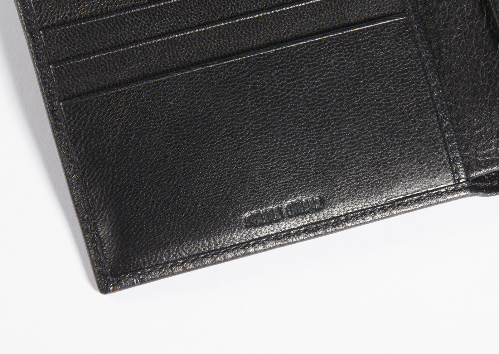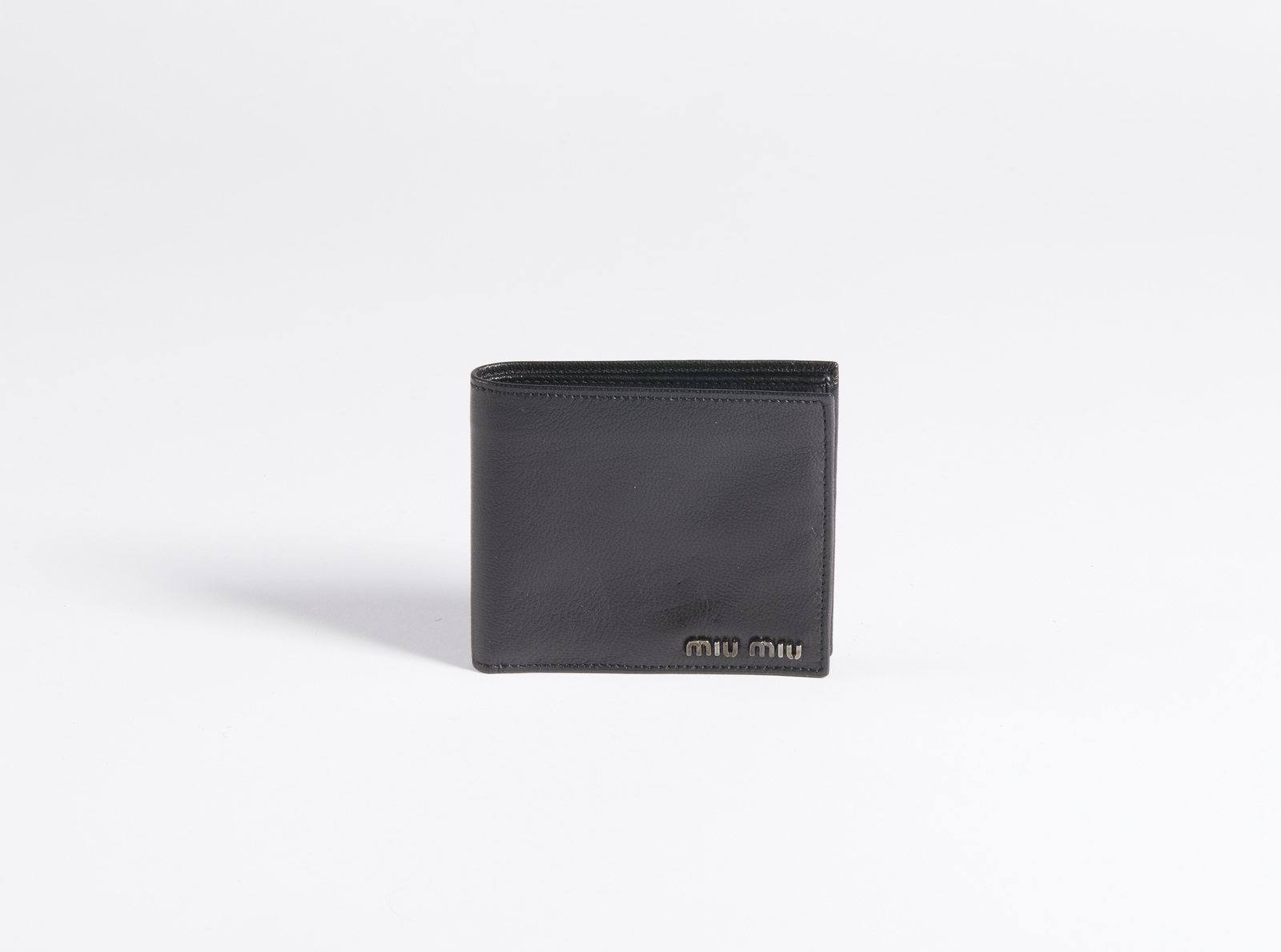 MIU MIU Portafoglio di Miu Miu in pelle nera. Pelle. Cm 11,00 x 9,50 x 0,50. Portafoglio in pelle nera con logo in hardware color metallo. L'interno del portafoglio è suddiviso in due scomparti per le banconote e uno dedicato all'alloggio di 8 carte di credito.