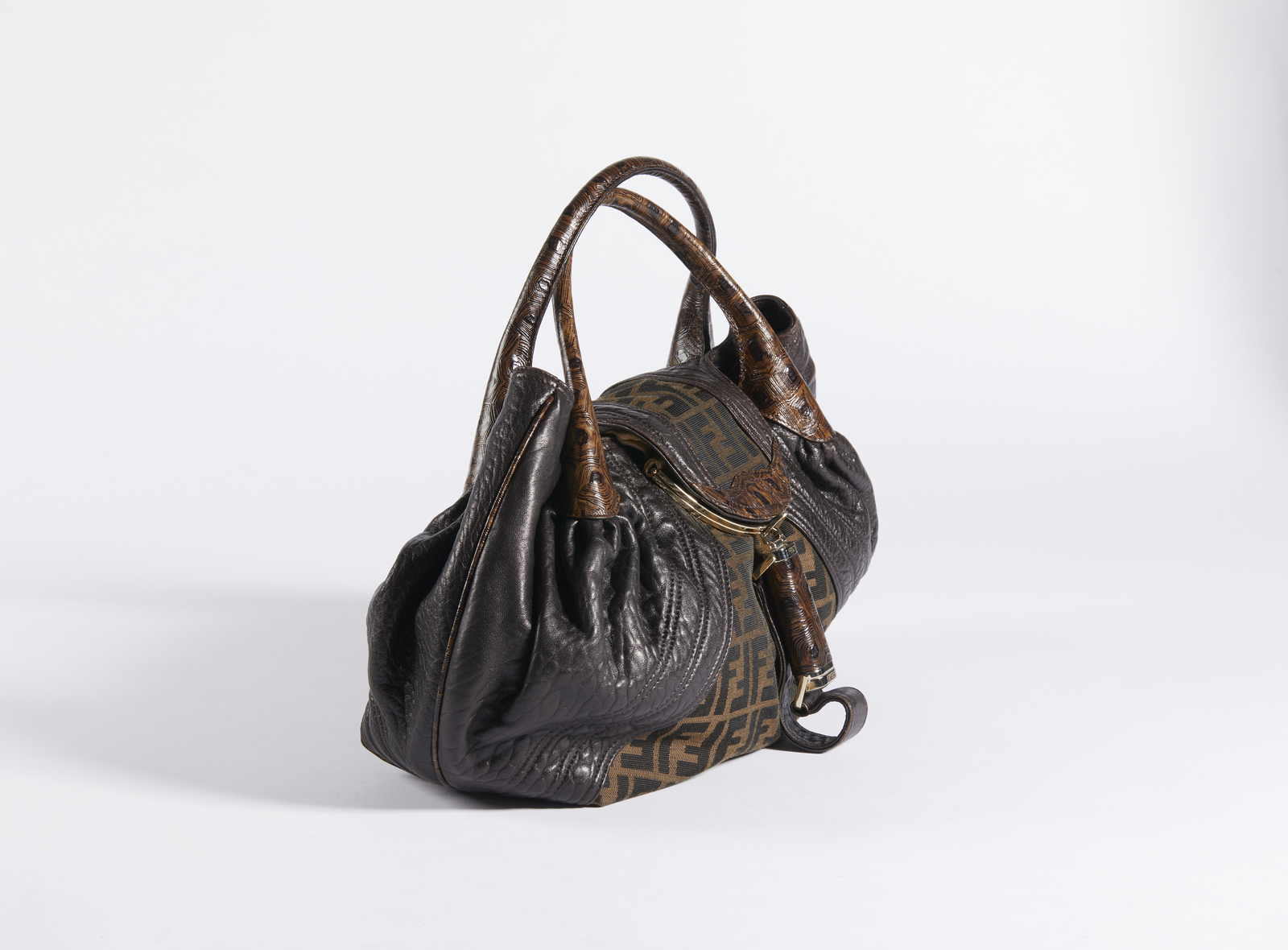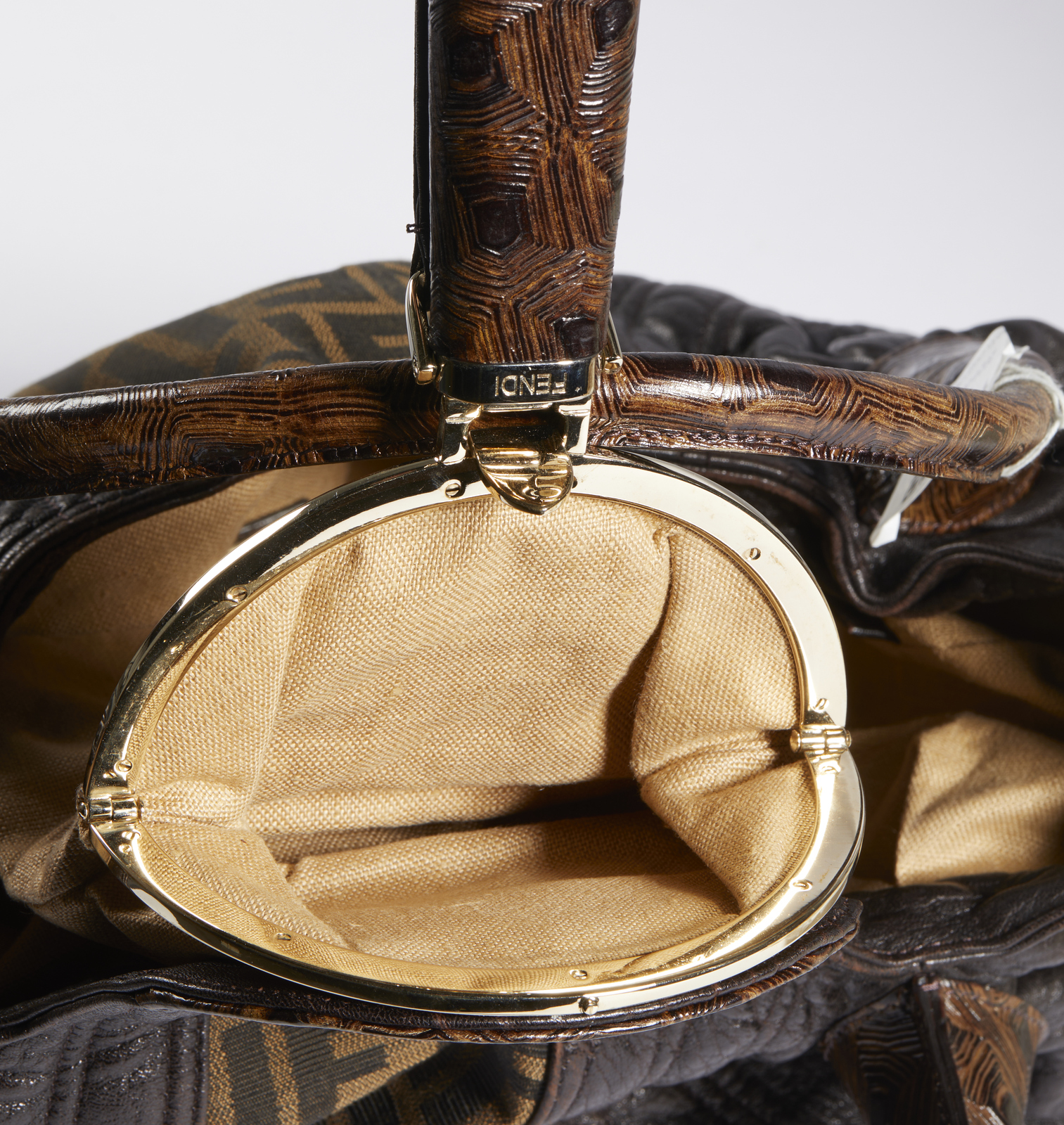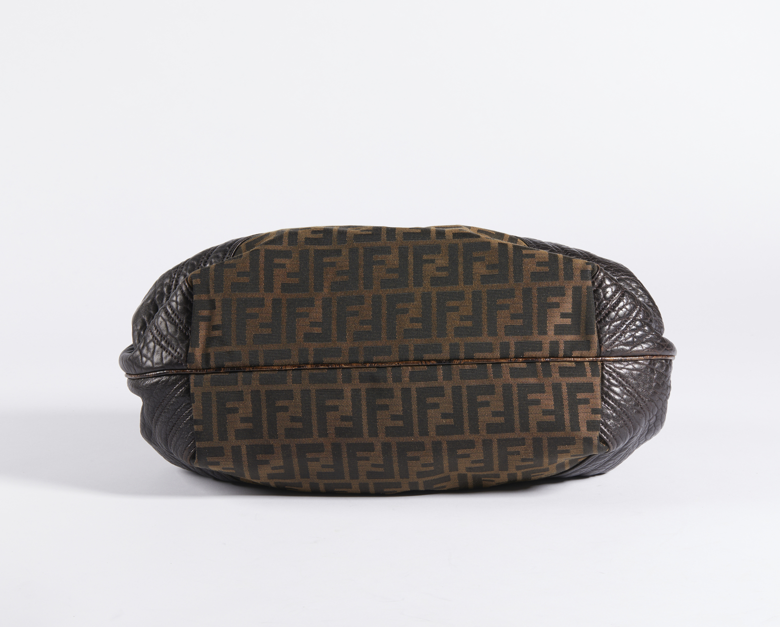 FENDI Borsa Spy in Tela e pelle. Tessuto e pelle. Cm 30,00 x 22,00 x 18,00. Borsa Spy in pelle e tessuto marrone.