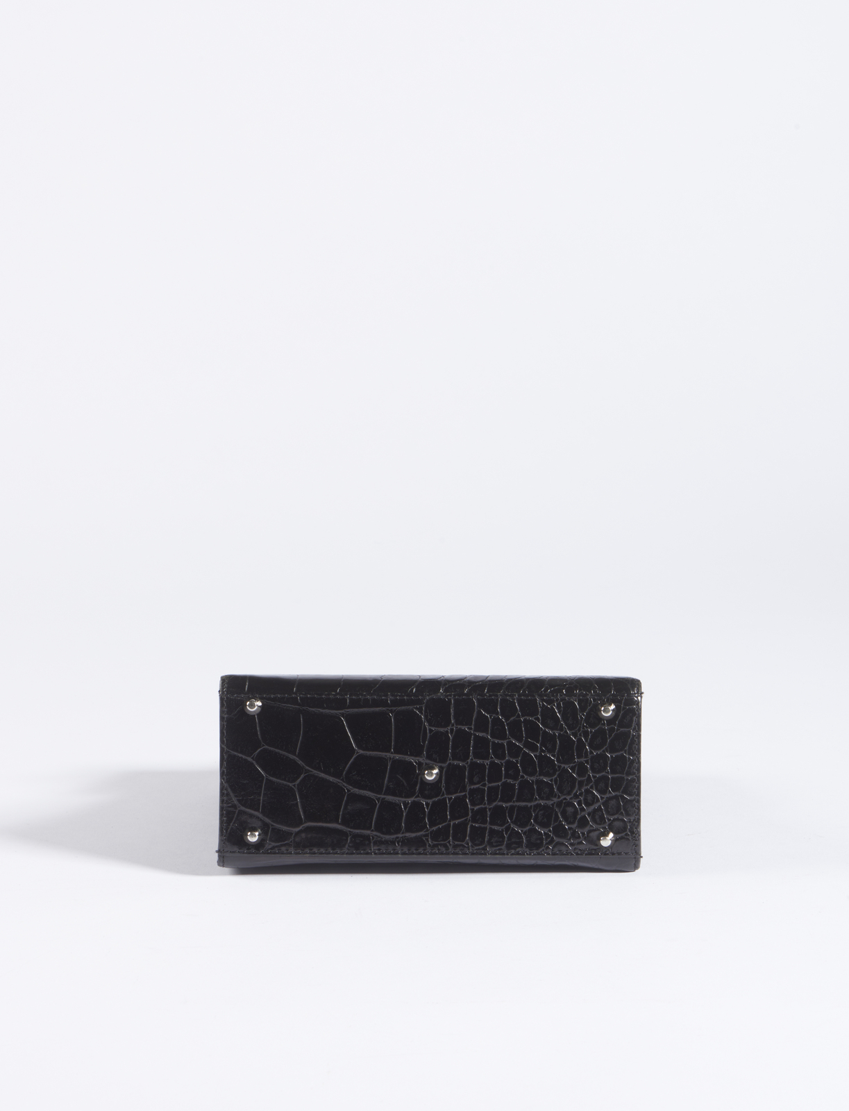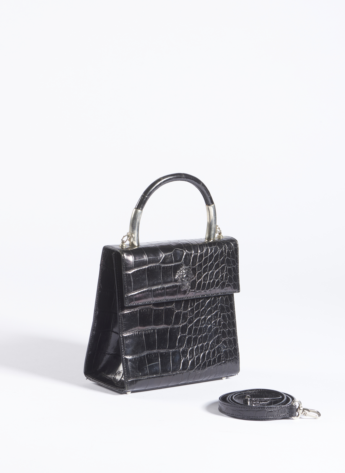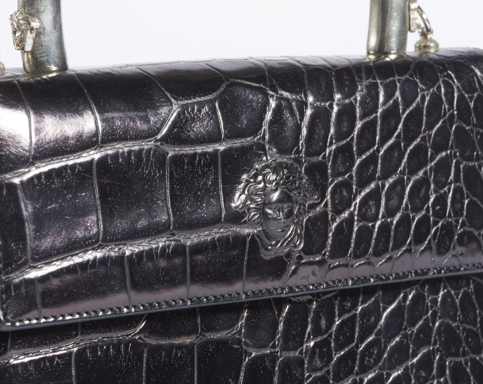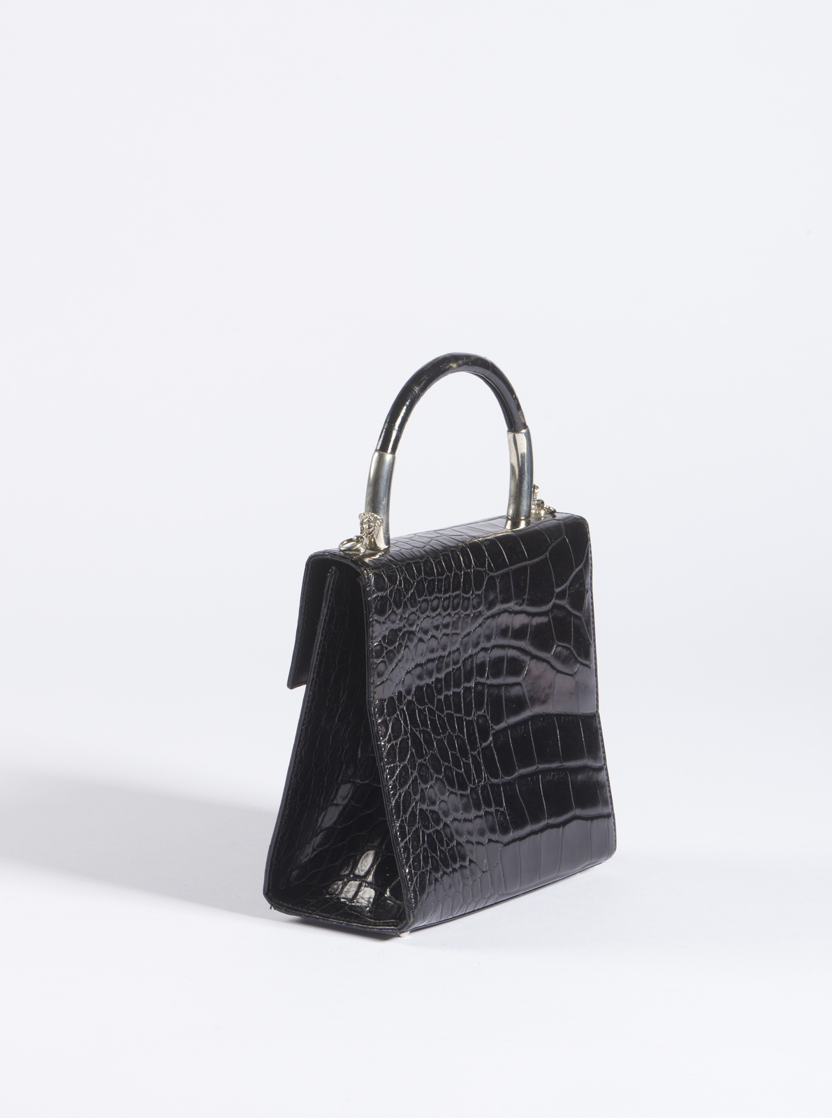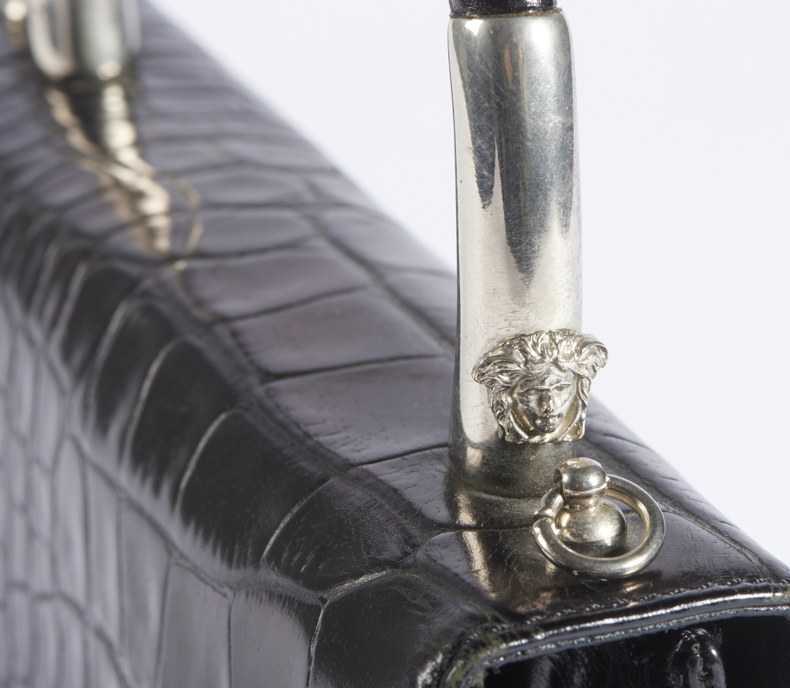 VERSACE GIANNI (1946 - 1997) Borsa a mano. Metallo e pelle. . Borsa a mano nera in pelle stampa cocco, con manico a mano e finiture in metallo con logo medusa, anni 90'. Tracolla removibile.