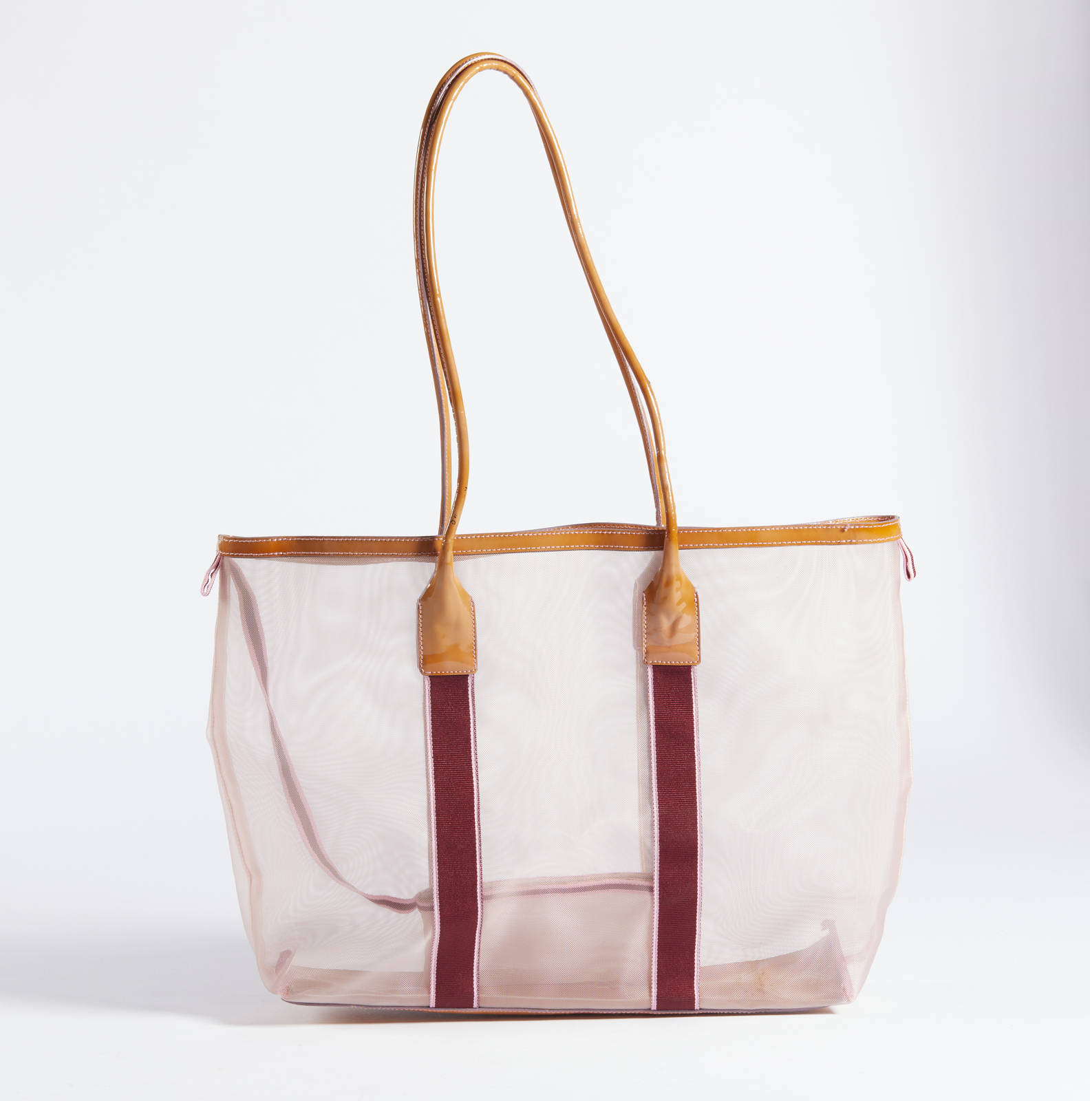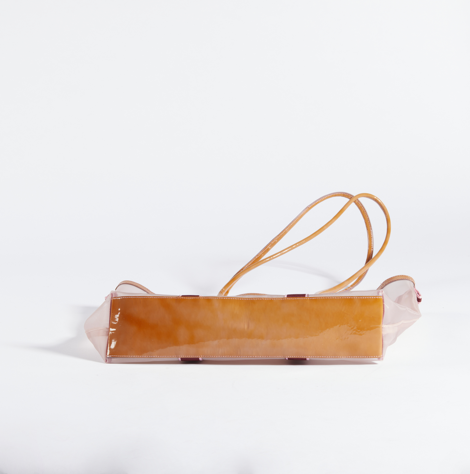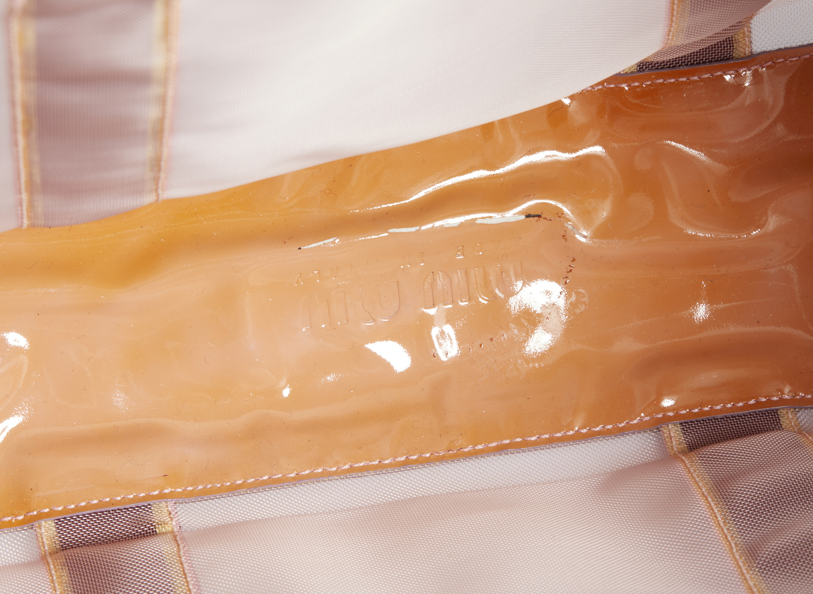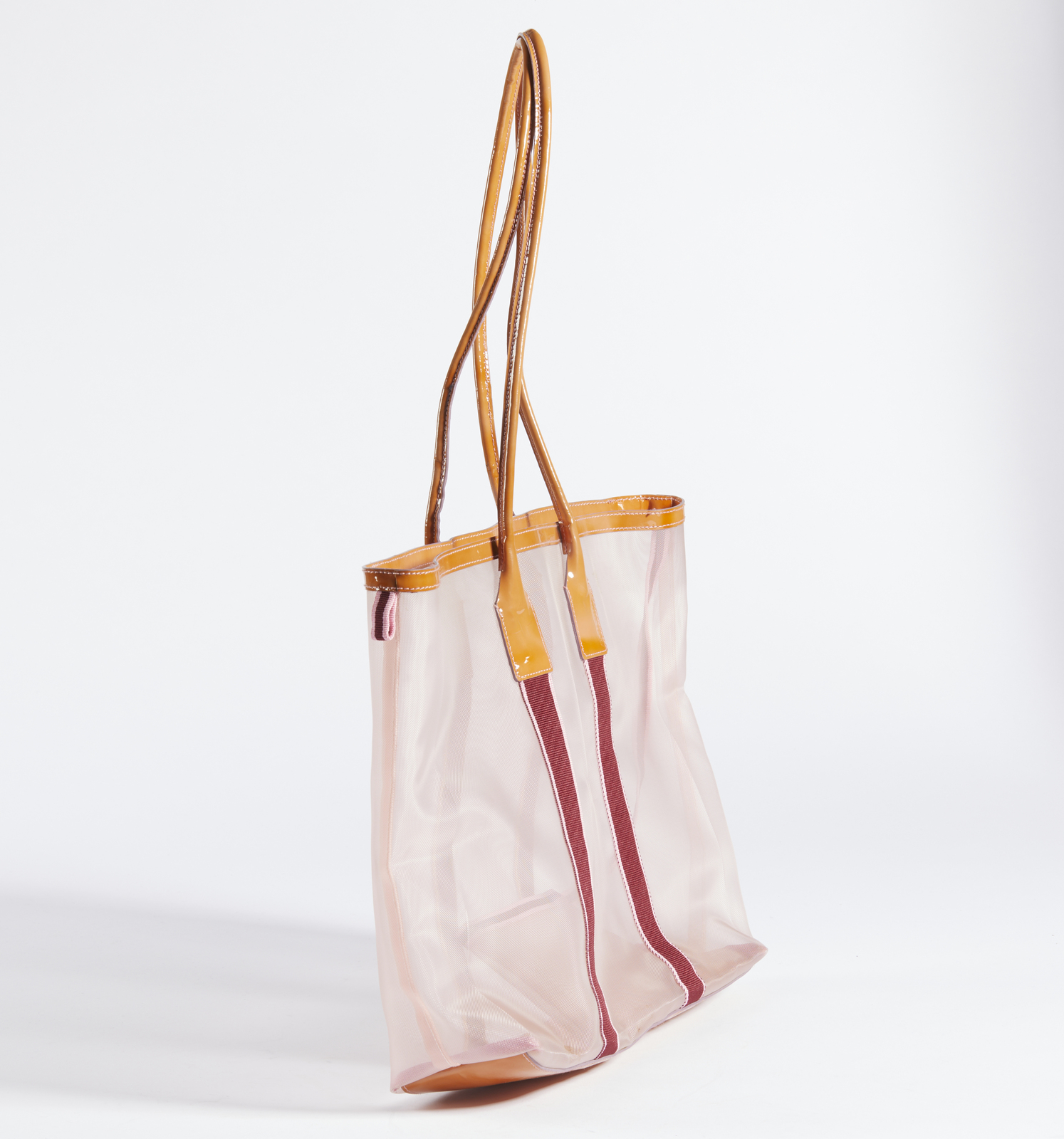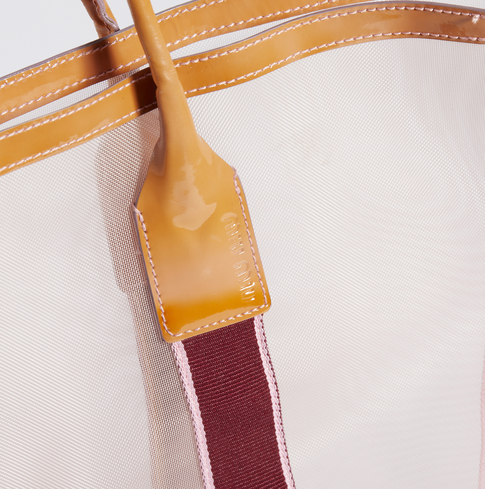 MIU MIU Borsa rosa in tessuto trasparente. Plastica. Cm 35,00 x 30,00 x 8,00. Borsa Shopping in plastica trasparente rosa con bande in tessuto. Pochette interna. Manici in vernice.