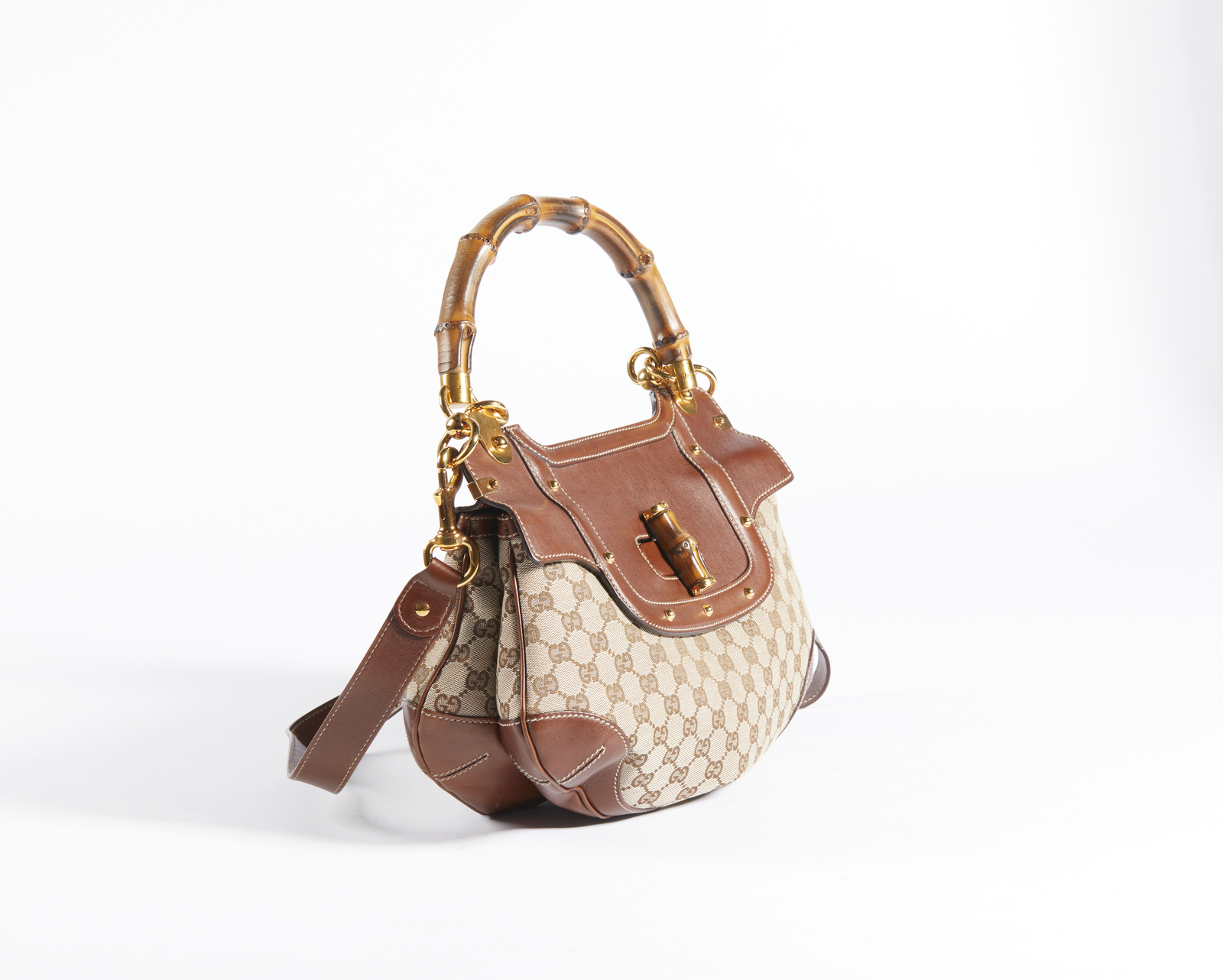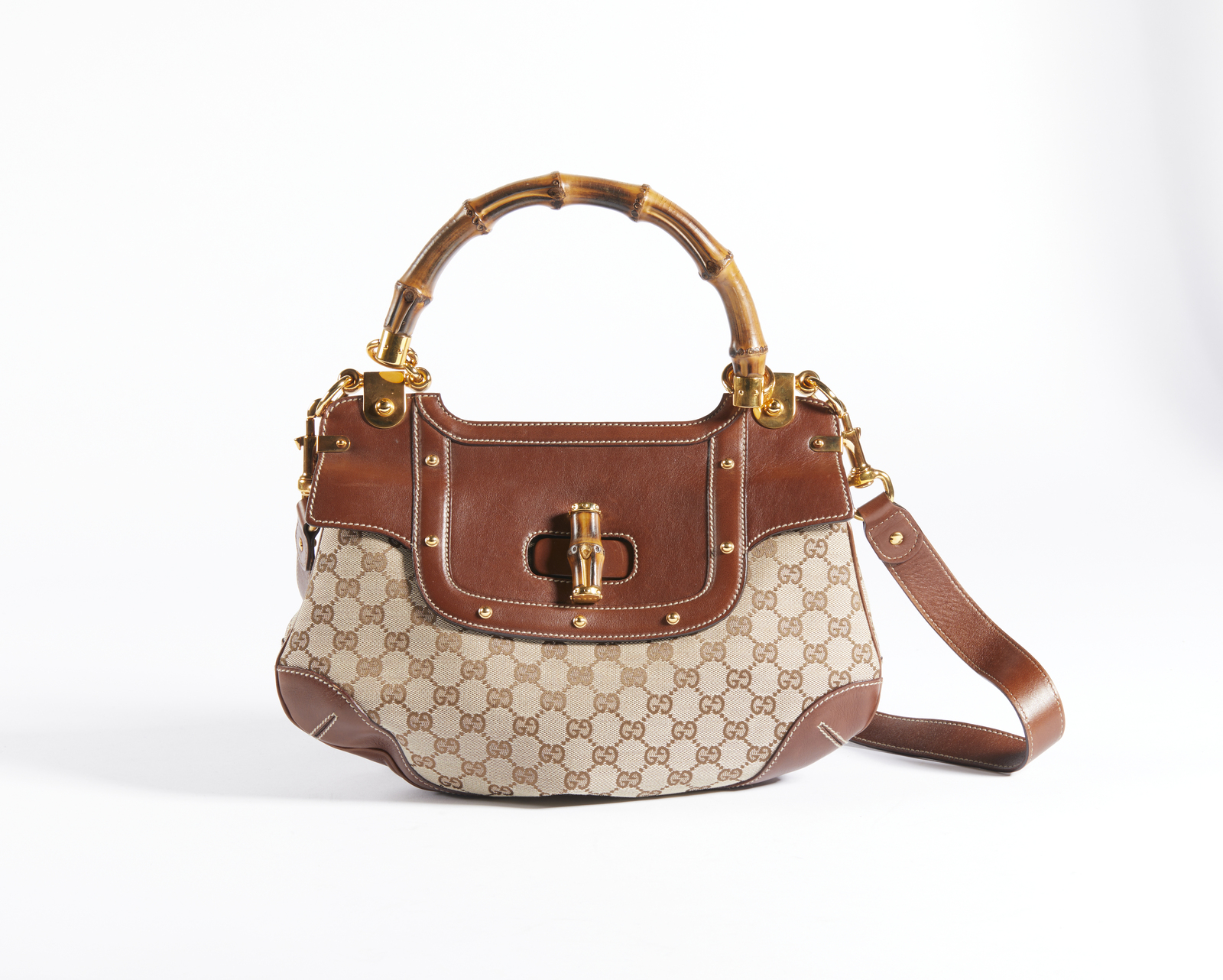 GUCCI Borsa Bamboo. Tessuto e pelle. Cm 36,00 x 26,00 x 5,00. Borsa a tracolla "Bamboo" Gucci in pelle marrone e panno. Un manico in bambù. Monogramma in panno marrone. Patta frontale con chiusura in bambù. Due scomparti con una tasca applicata con zip sul primo. Hardware dorato. Fodera in tessuto Gucci. Forma arrotondata. Venduto con tracolla regolabile e removibile e sacchetto antipolvere.