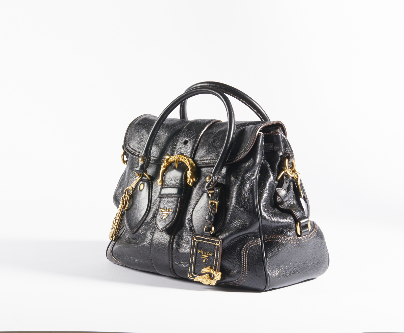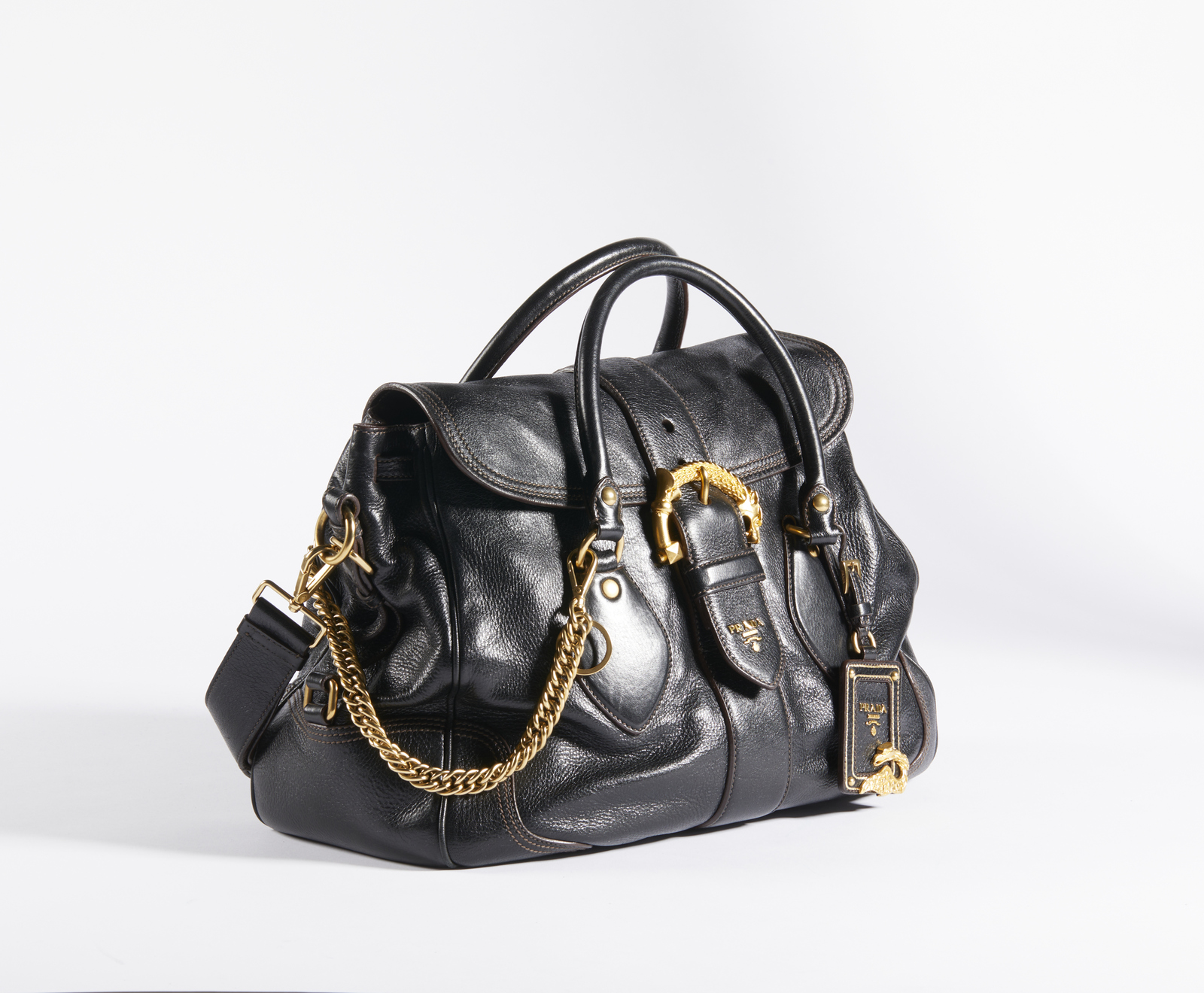 PRADA MILANO Borsa di pelle nera. Pelle. Cm 40,00 x 28,00 x 17,00. Borsa a mano in pelle nera con Hardware color oro. Chiusura con calamita e fibbia con logo Prada sul fronte. Catena decorativa sul fianco della borsa. Tracolla in pelle. Medaglietta in pelle con logo.