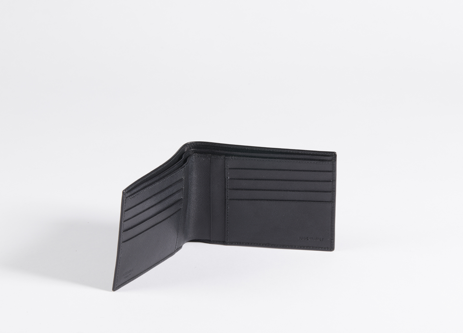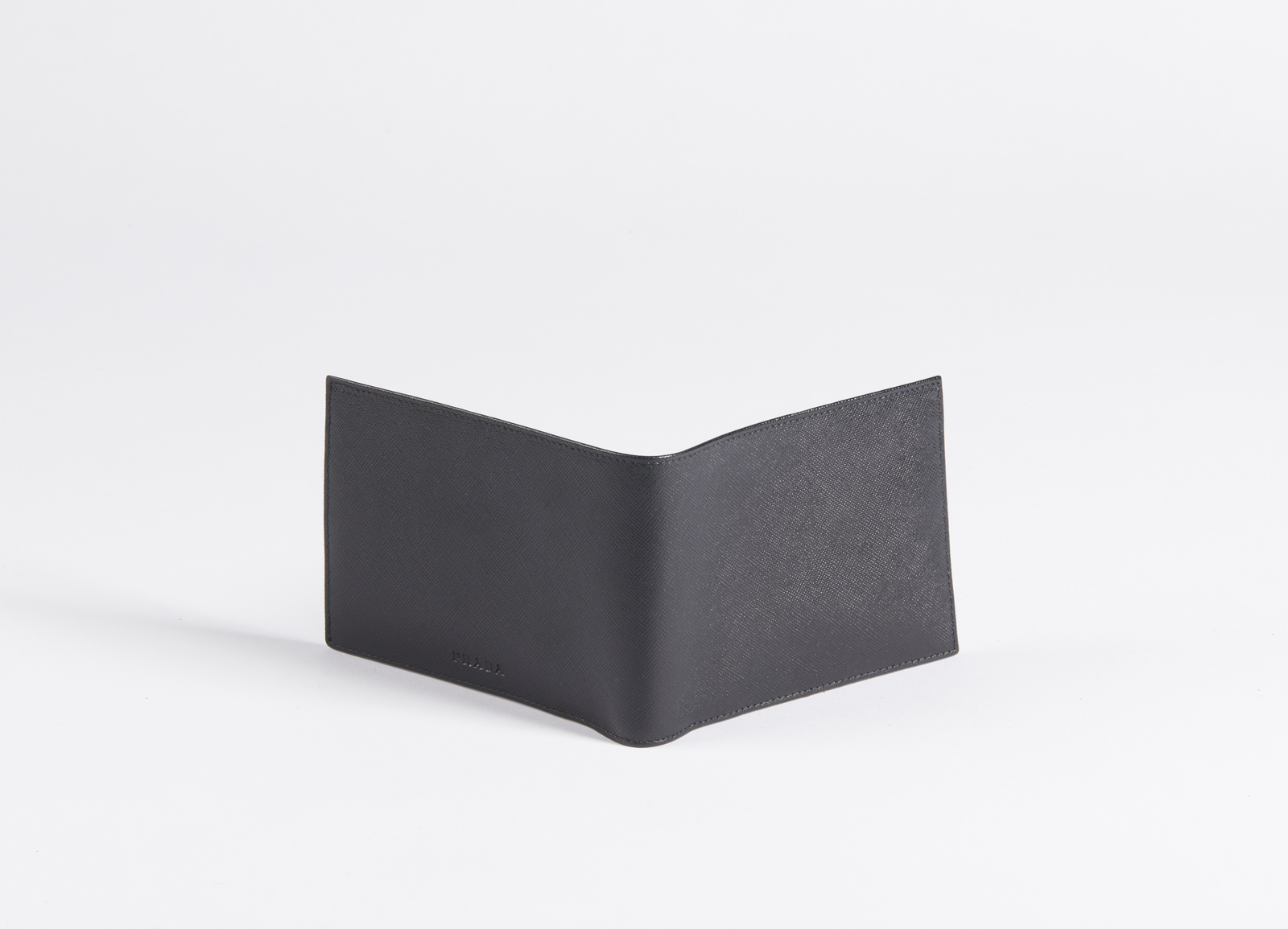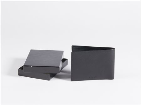 PRADA MILANO Portafoglio di pelle nera. Pelle. Cm 13,50 x 10,00 x 1,00. Portafoglio di pelle nera con otto porta carte di credito e due scomparti per le banconote.