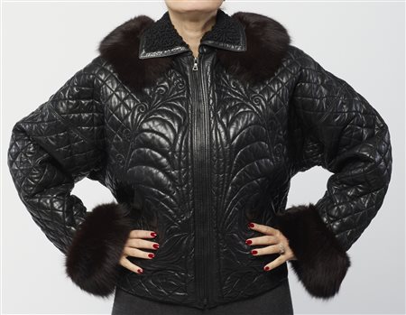 VERSACE GIANNI (1946 - 1997) Bomber trapuntato nero con cappuccio con dettagli in pelliccia. 1990. Pelle. . Bomber imbottito in pelle nera trapuntata e lana, collo di pelliccia nera removibile. Etichetta interna Gianni Versace, Prima metà anni '90.