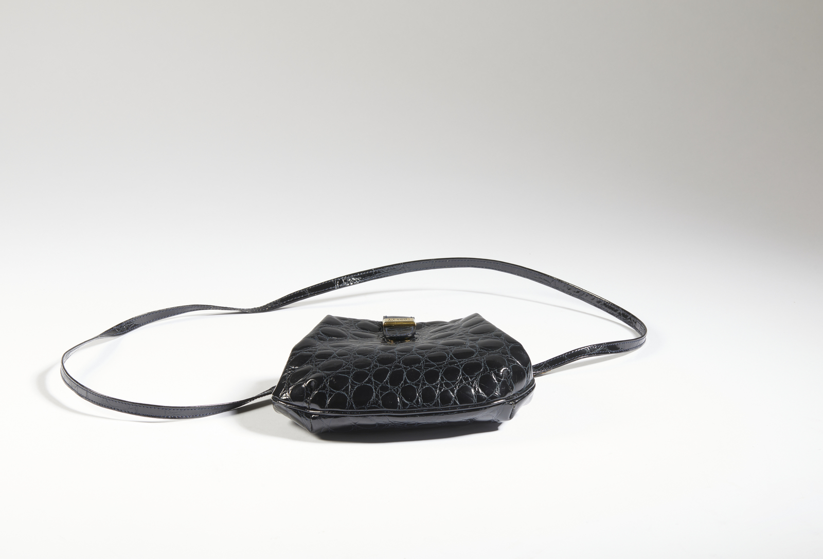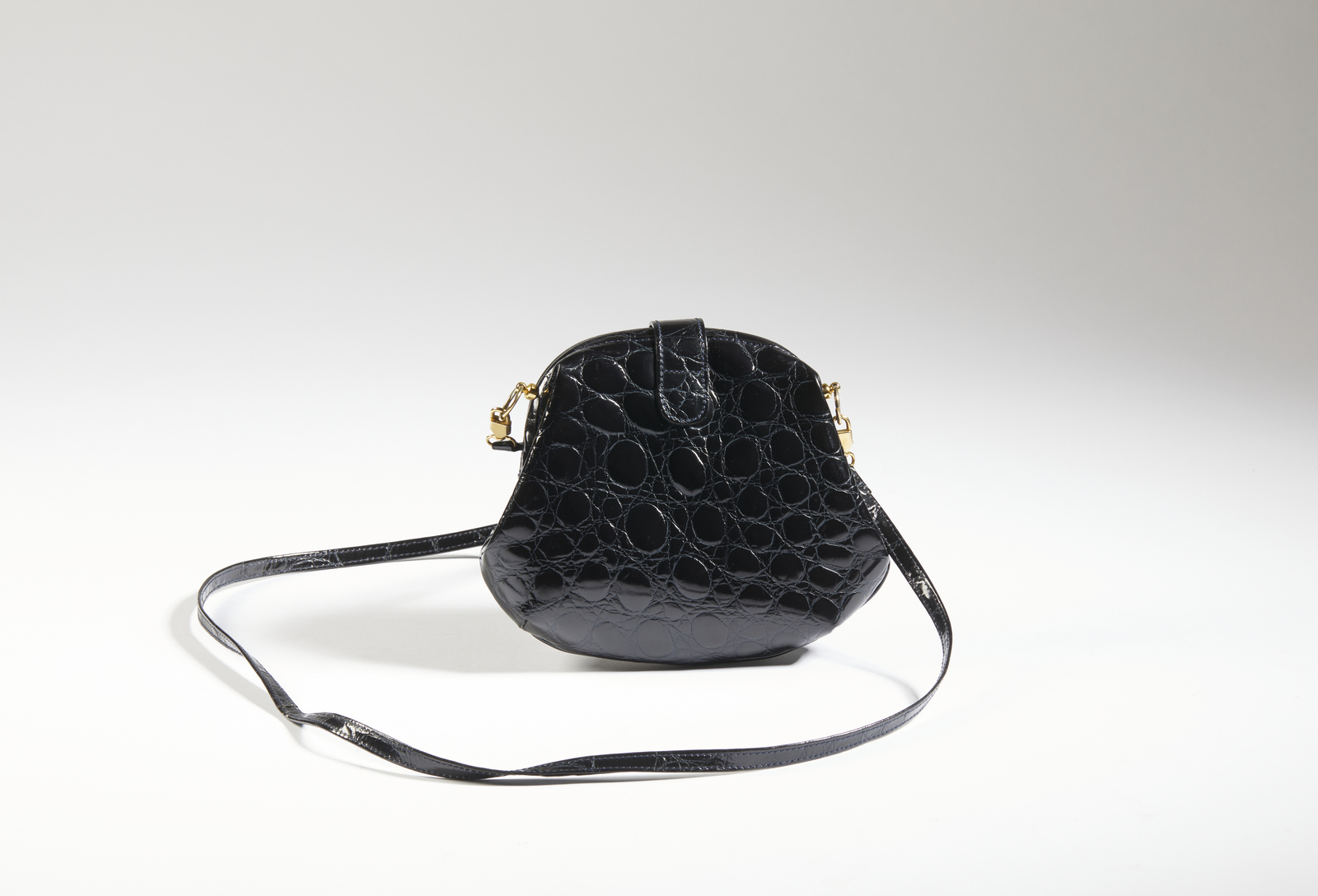 FERRE' GIANFRANCO Borsa in pelle nera. Pelle. Cm 20,00 x 19,00 x 5,00. Borsetta in pelle nera stampa cocco Gianfranco Ferré vintage, da indossare a mano come pochette o a tracolla, tracollina removibile con dettagli in hardware dorato. Passante a linguetta sul fronte, chiusura a calamita, decorato da elemento in hardware dorato con logo Ferré in caratteri neri e numero dell'articolo n° 13319 in edizione limitata. Interni foderati in tessuto logo nero, una taschina interna con chiusura con cottone a pressione. Eccellenti condizioni, fine anni '90.