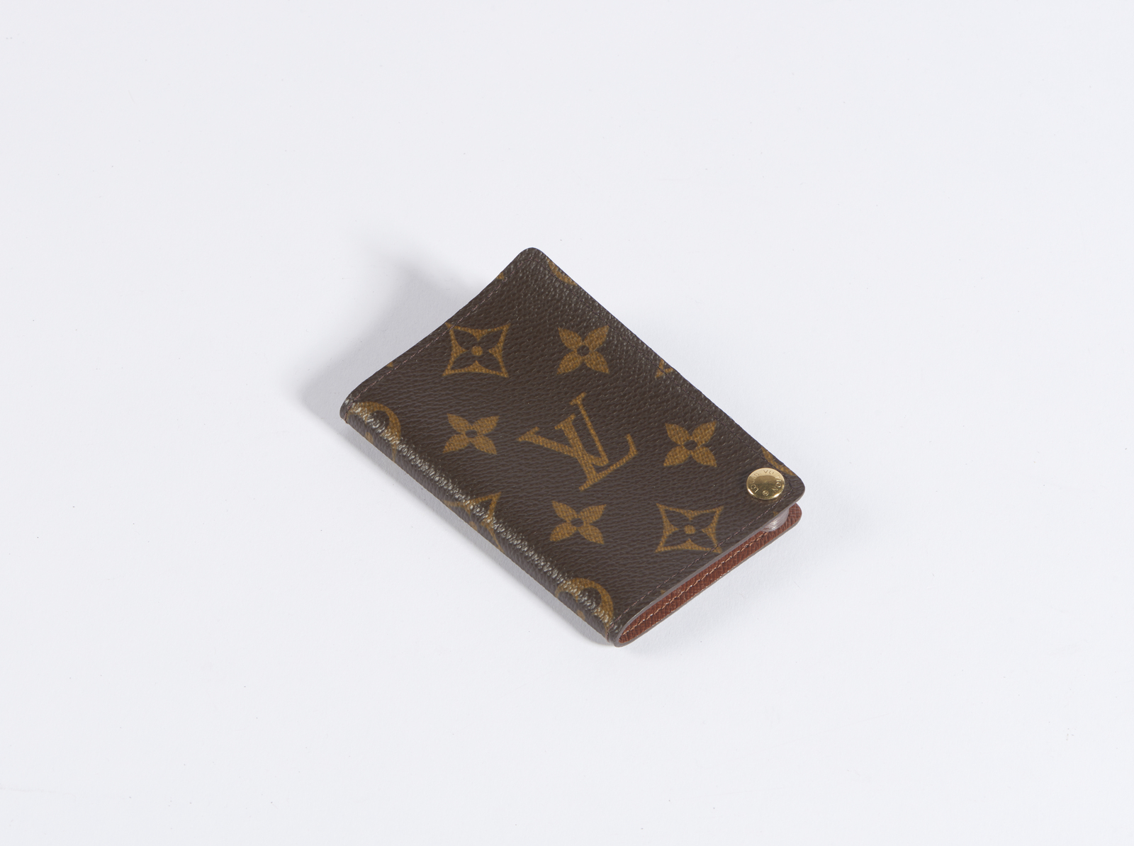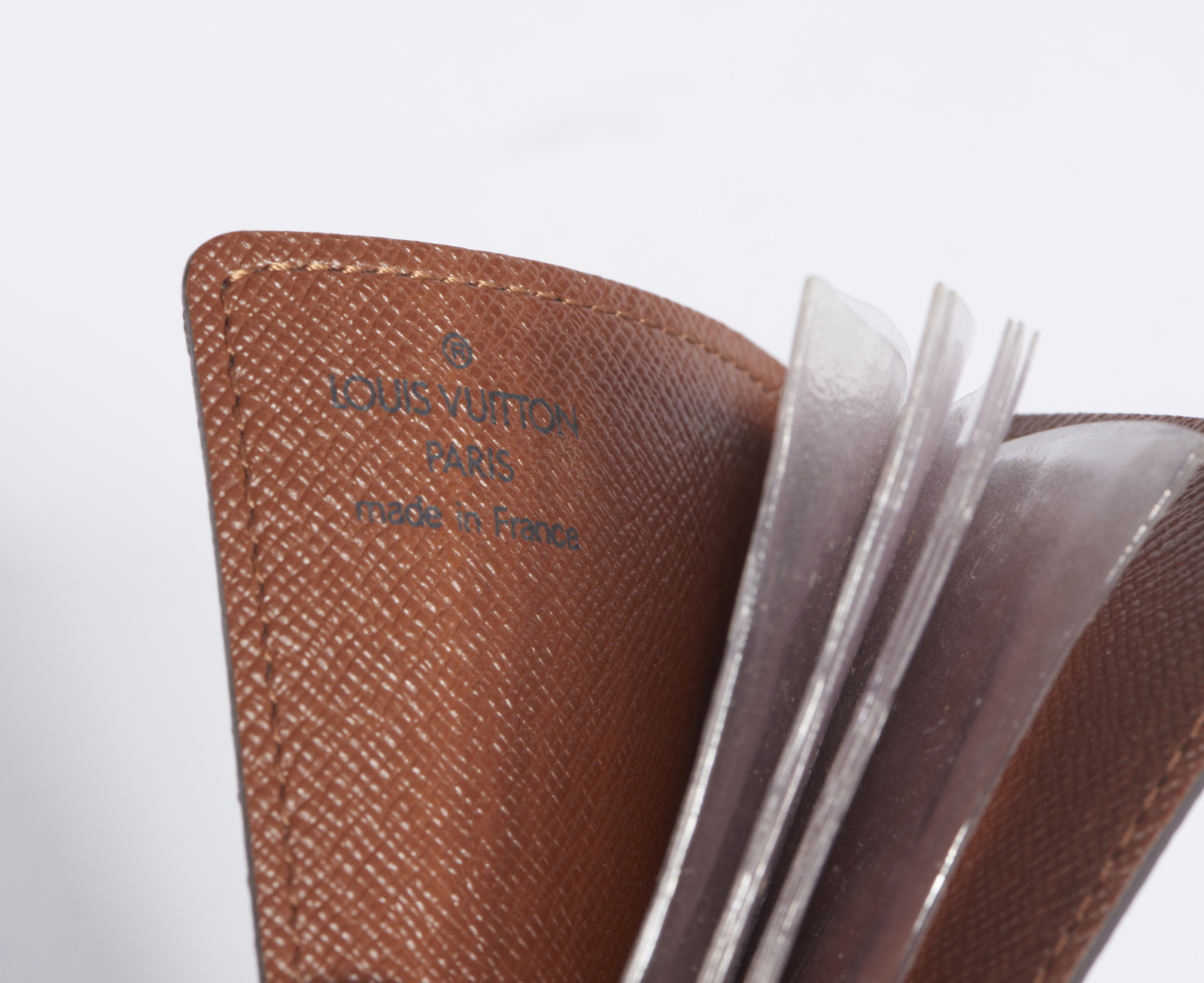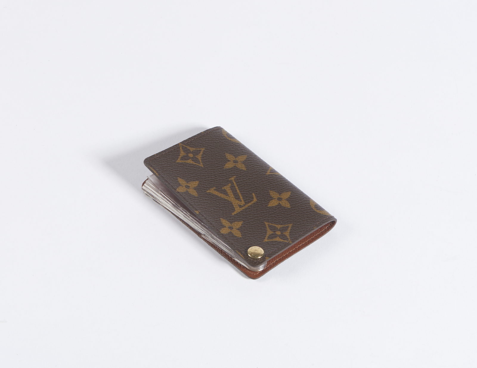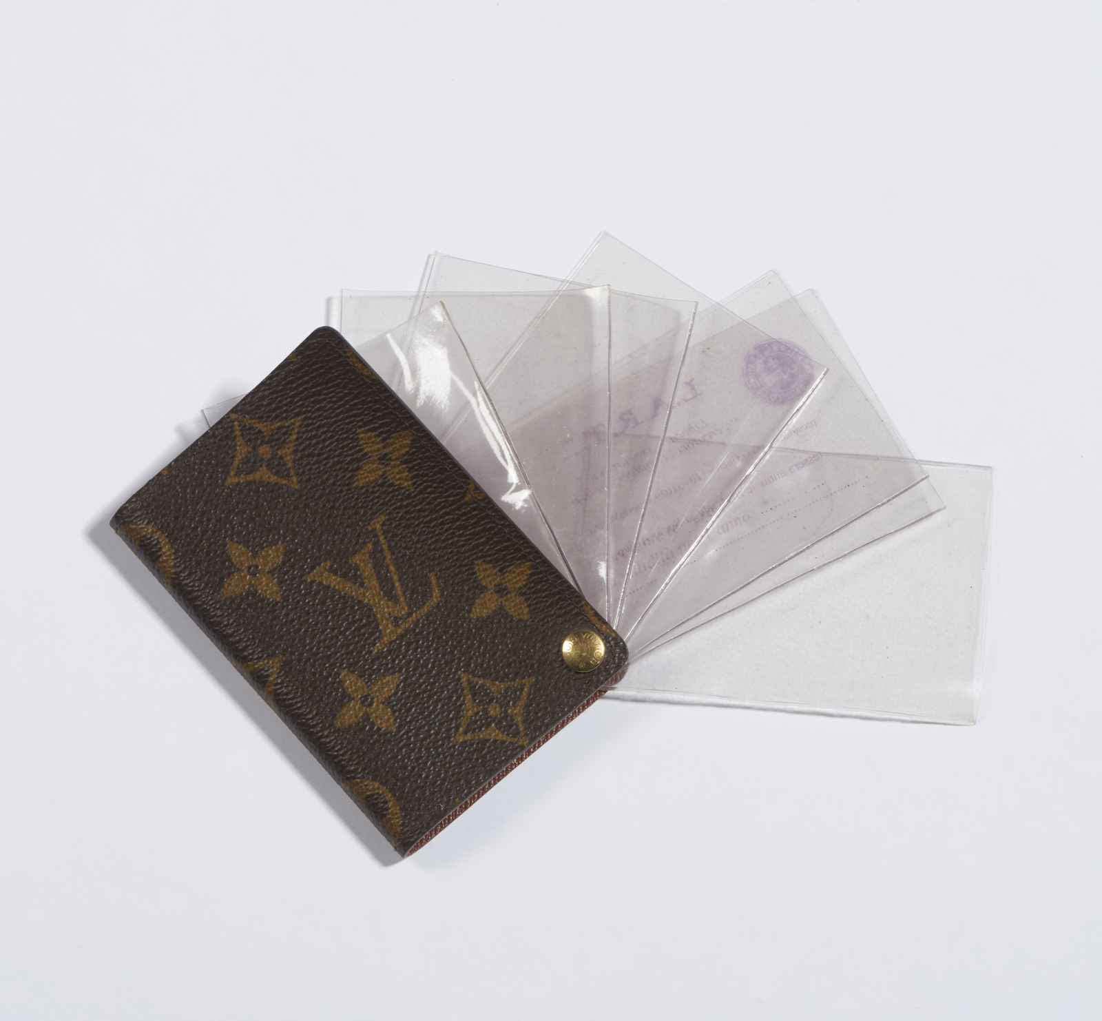 VUITTON LOUIS Porta carte. Canvas. Cm 7,00 x 10,50 x 1,00. Porta carte Louis Vuitton vintage, in canvas monogram, all'interno 7 bustine in plastica trasparente per conservare carte o biglietti da visita, fermate da un bottone in hardware dorato in basso con inciso Louis Vuitton, Logo Louis Vuitton/Paris/Made in France all'interno. Eccellenti condizioni.
