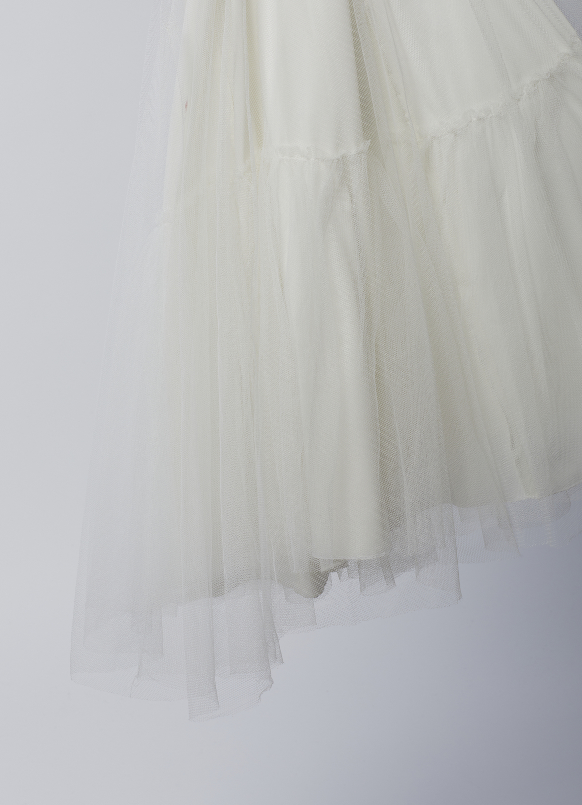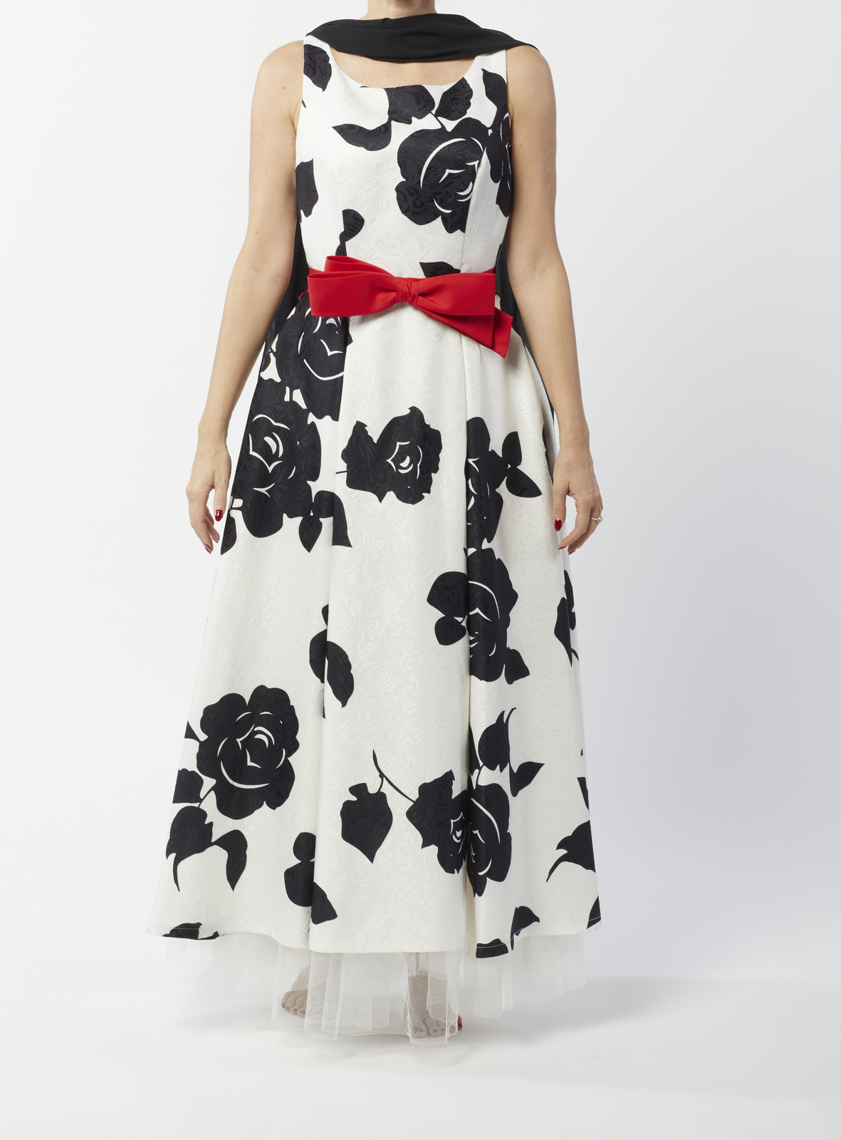 VIVIEN Abito fantasia bianco e nero. . . Elegante abito in stile anni '60, in tessuto stampato a motivo di rose nere su fondo bianco, cintura rossa alla vita, balza finale interna in tulle bianco, sciarpa in tessuto nero, senza maniche, zip al retro, etichetta Vivien, taglia 42 IT.