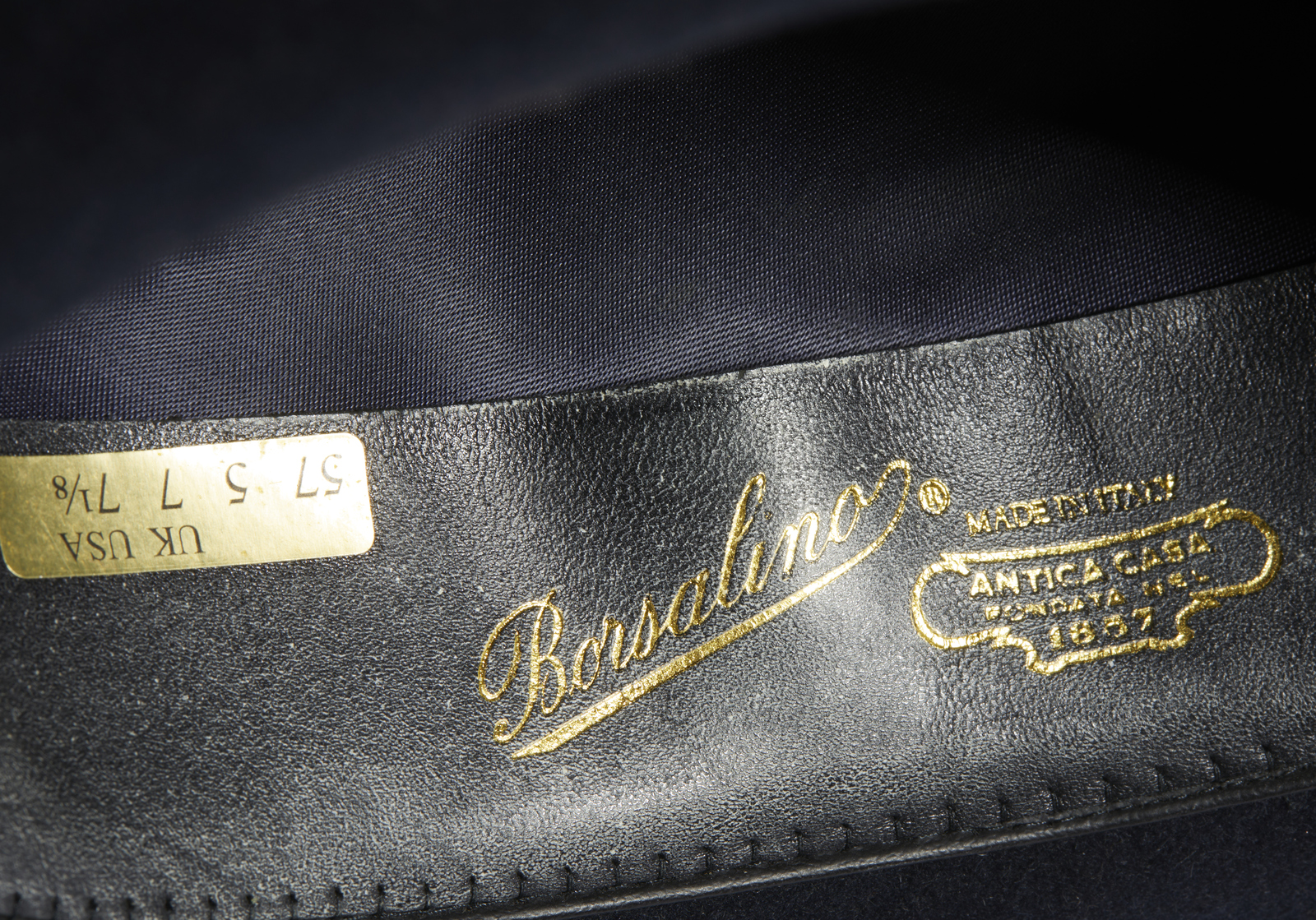 BORSALINO Cappello Borsalino blu. Lana e seta. . Elegante cappello da uomo Borsalino in feltro di lana ed interno in fodera di seta, blu notte, con nastro in gros-grain in tonalità recante la firma Borsalino in caratteri dorati. Firma Borsalino in caratteri dorati all'interno, come la taglia,.Taglia 57, UK 7,USA 7.