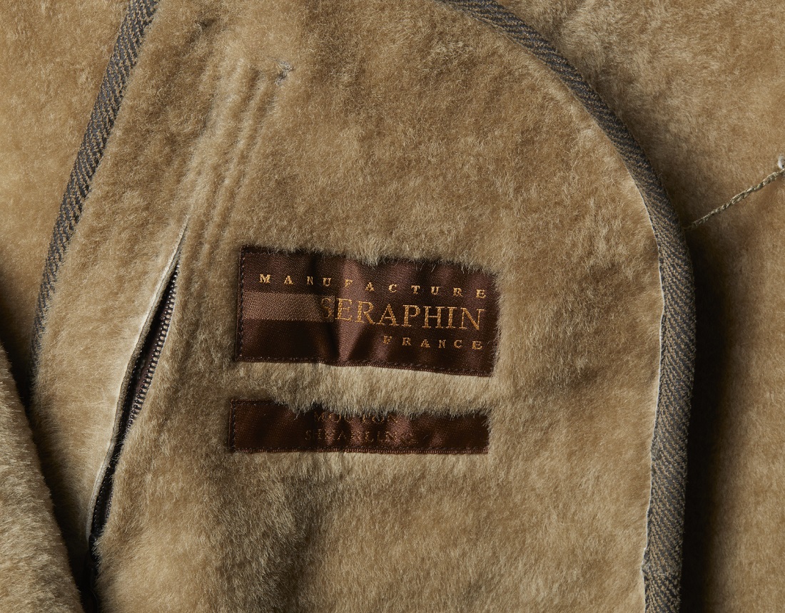 SERAPHIN FRANCE Cappotto Montone. Pelle e pelliccia. . Intramontabile capospalla in montone beige con dettagli in pelliccia color cammello, chiusura a bottoni, tre quarti, tasche aperte. All'interno etichetta Manufacture Seraphin/ France. Le misure del modello sono: taglia 52, altezza 190 cm.