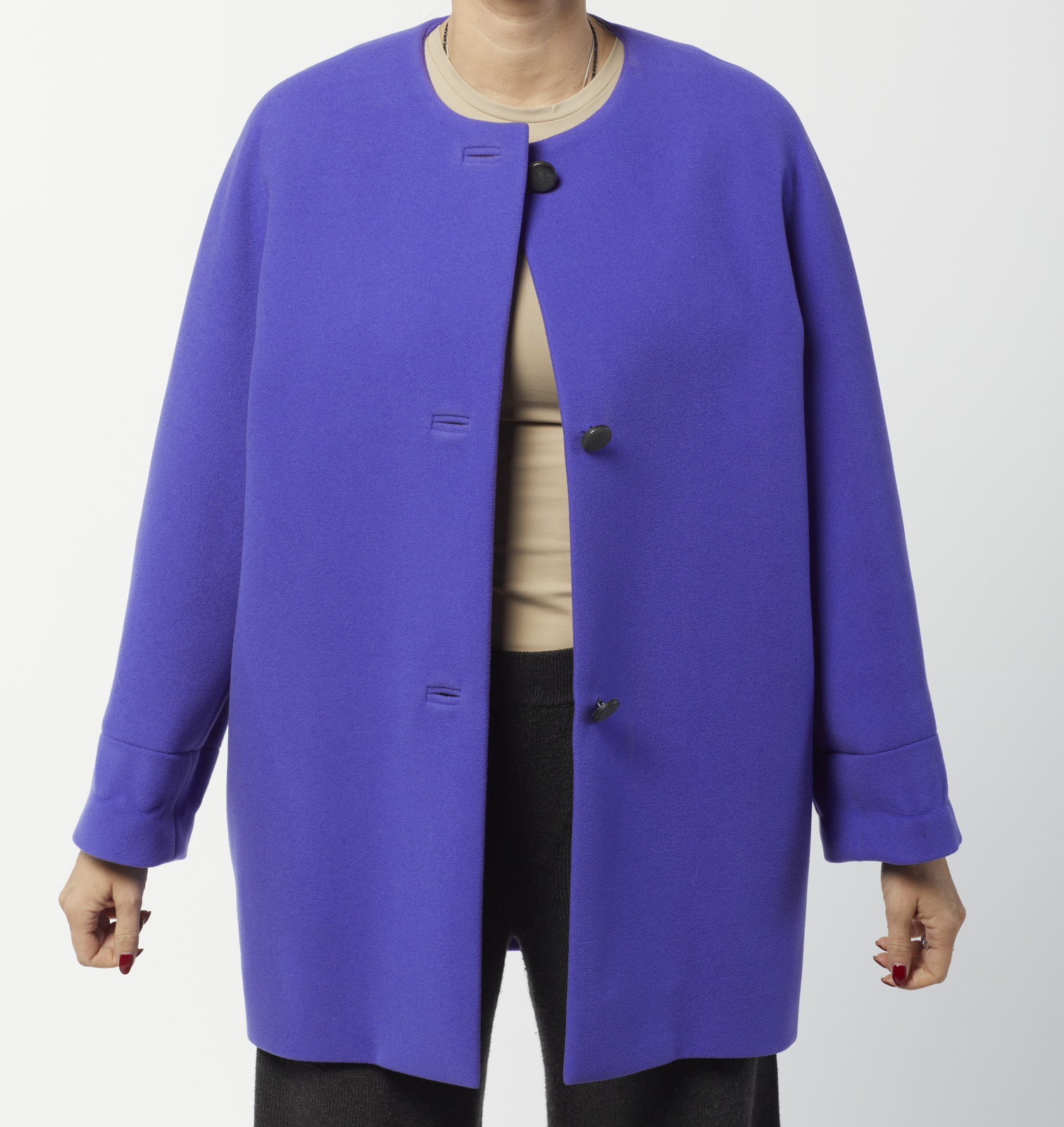BALENCIAGA Spolverino blu elettrico. . . Spolverino Balenciaga vintage blu elettrico, tre bottoni neri a contrasto, fodera nera, linea ad uovo, etichetta Balenciaga Paris presente. Linea senza spalle vestibilità oversize. La modella indossa generalmente una taglia 40IT ed è ALTA 170 CM.