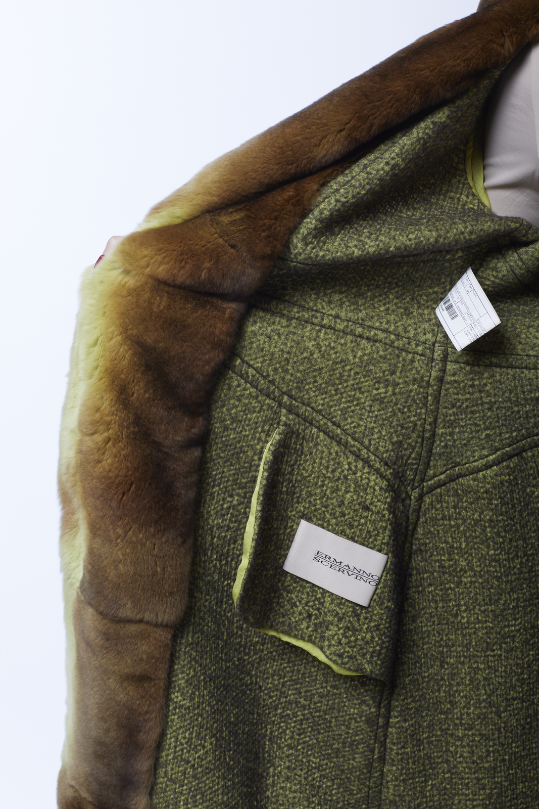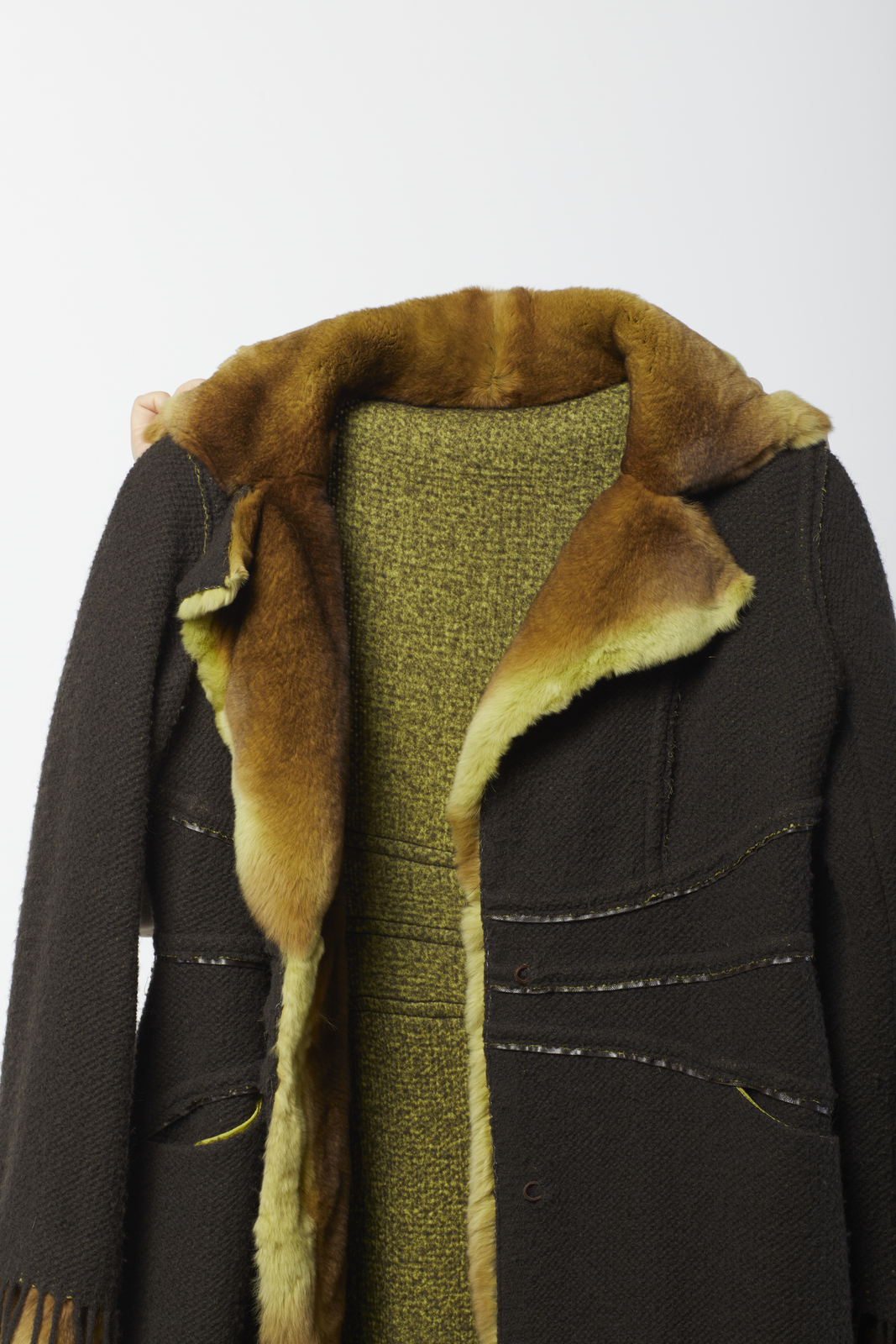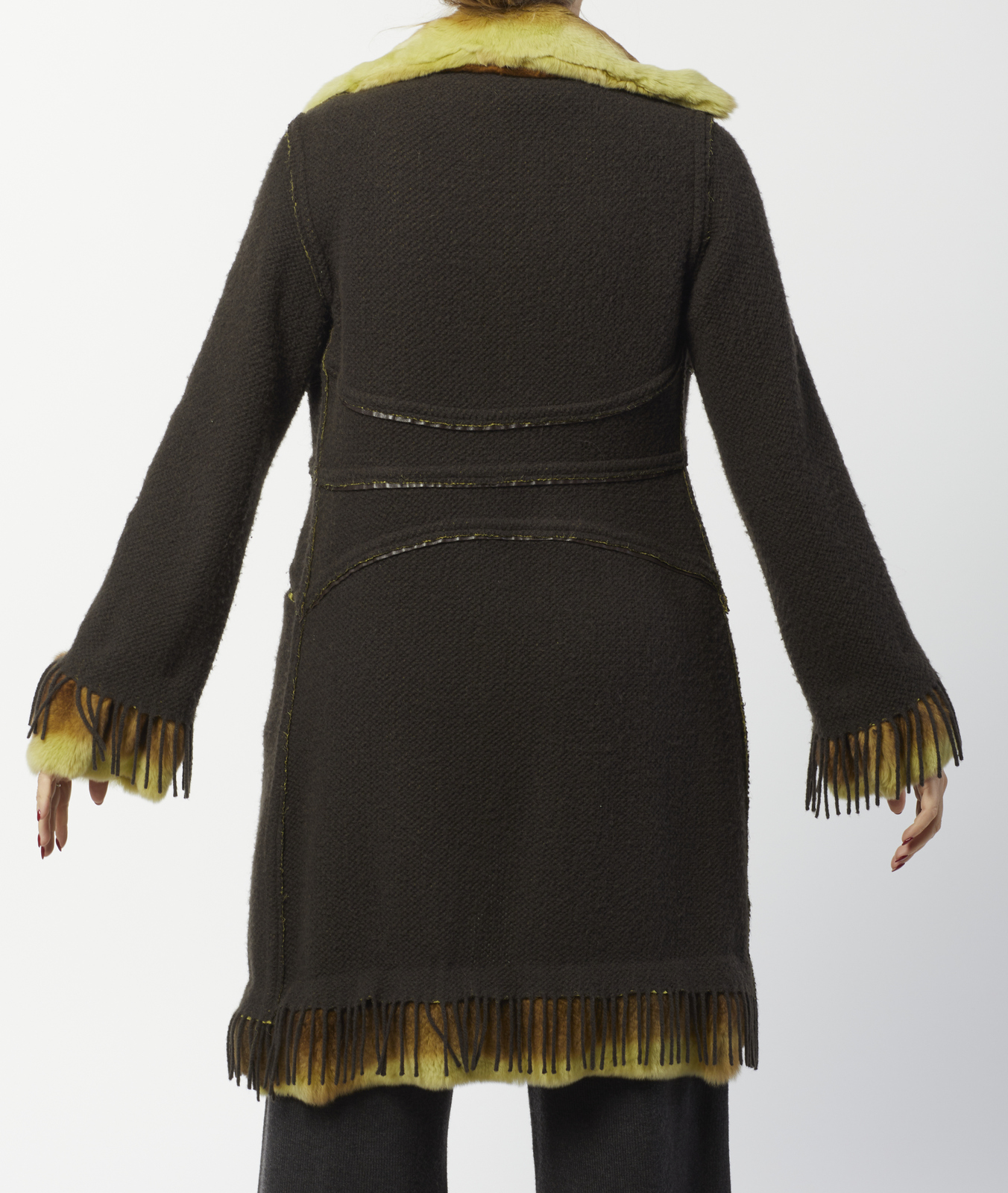 SCERVINO ERMANNO Cappotto in lana nero con dettagli in pelliccia. Lana.. . Cappotto tre quarti Ermanno Scervino vintage in lana nera, dettagli all'orlo inferiore ed alle maniche a frange; con grandi revers del collo, profili frontali, bordi inferiori e maniche decorate con dettagli in pelliccia in marrone degradé, elementi di cuciture decorative alla vita ed al giro spalla, interno in tweed verde lime, etichetta Ermanno Scervino ed etichetta tessile presenti. taglia M.
