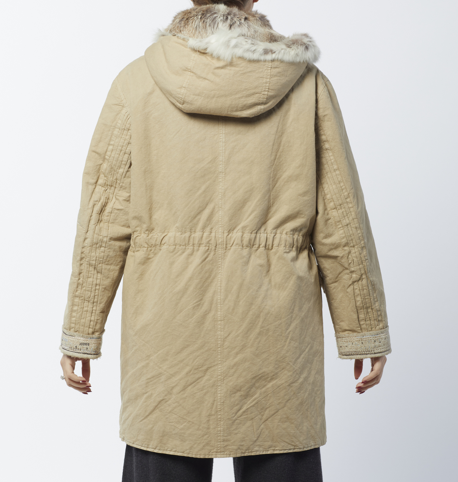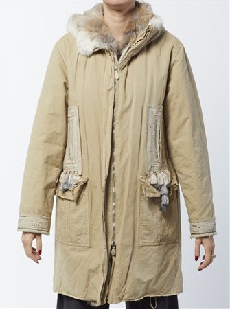 SCERVINO ERMANNO Parka con dettagli in pelliccia. . . Parka beige tre quarti Ermanno Scervino vintage, con dettagli del cappuccio e profili frontali interni in pelliccia, chiusura a zip, du tasche frontali, due tasche frontali con passamaneria beige chiaro con apertura verticale impreziosite alla base con nappine, bordo delle maniche decorato con passamaneria beige chiaro, interno foderato in piumino leggero beige, etichetta Ermanno Scervino. Maglia M.