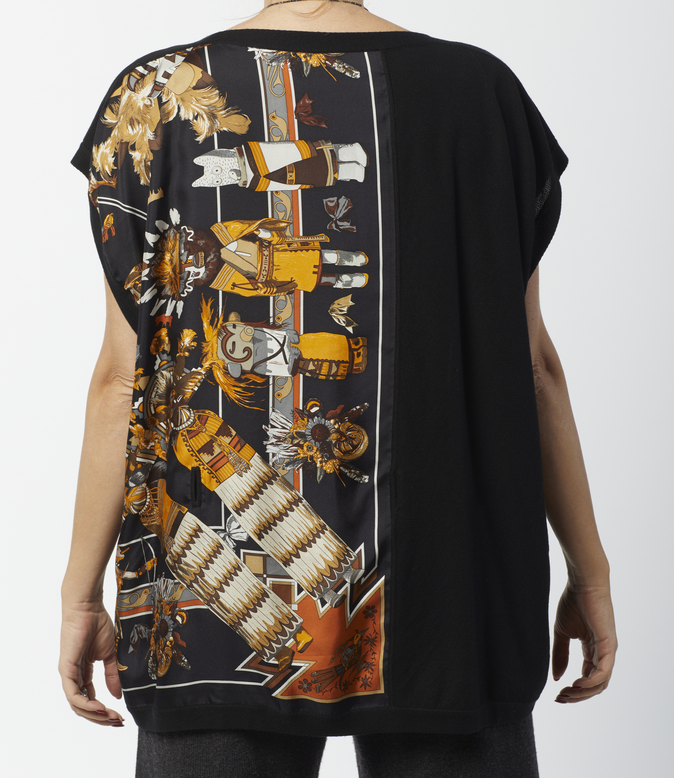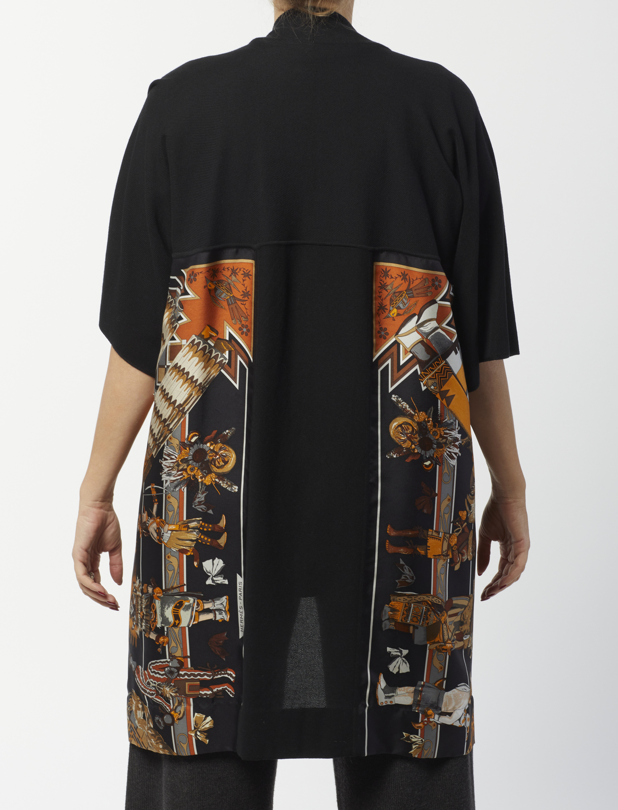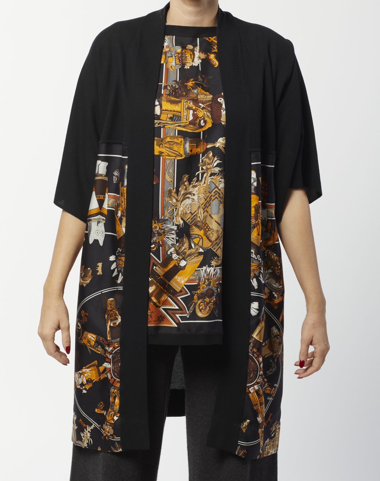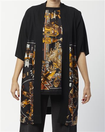 HERMES Twin set multicolore. Cotone e seta. . Twin set in jersey di cotone e seta Hermès vintage, composto da una maglia a maniche corte nera con pannello in seta stampata motivo Kashinas di Kermit Oliver, design del 1992, cardigan aperto tre quarti coordinato nero con pannello stesso motivo, interno foderato a stampa Kashinas, etichetta Hermès/ Paris/ Made in France, etichetta tessile, taglia FR 34 (IT 38). La modella abitualmente veste una taglia 40it ED è ALTA 170 CM