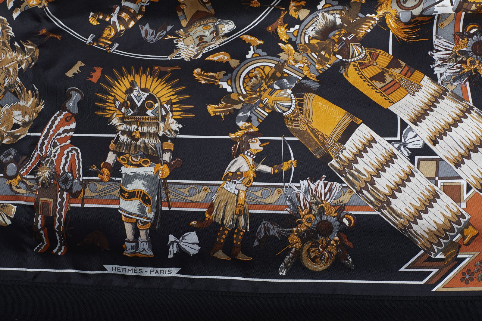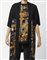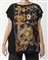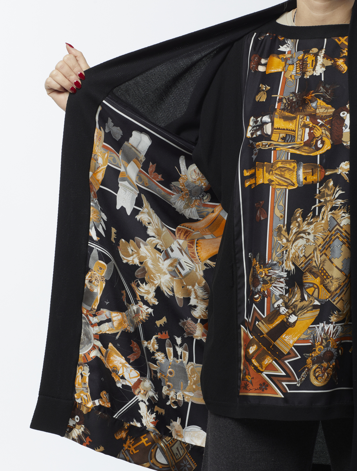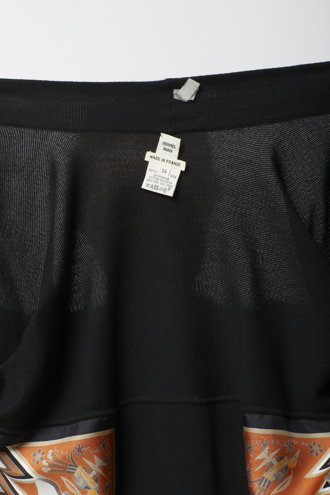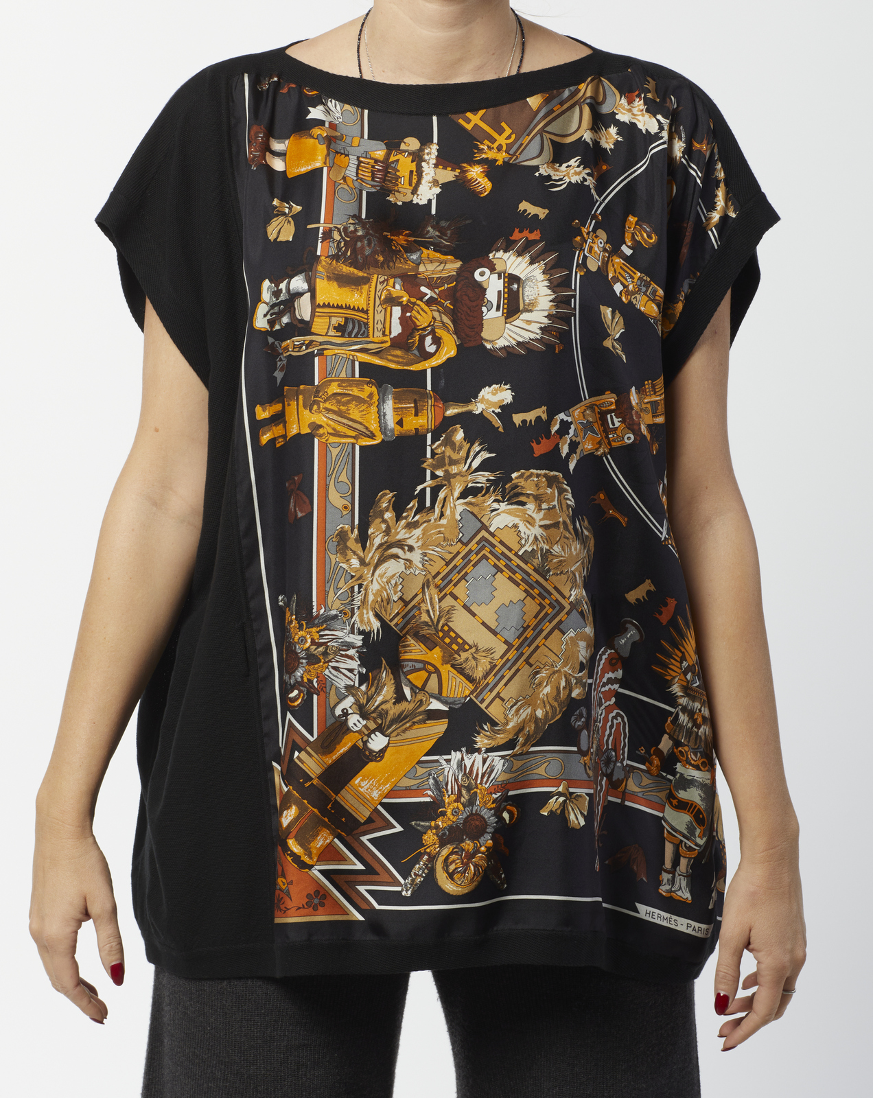 HERMES Twin set multicolore. Cotone e seta. . Twin set in jersey di cotone e seta Hermès vintage, composto da una maglia a maniche corte nera con pannello in seta stampata motivo Kashinas di Kermit Oliver, design del 1992, cardigan aperto tre quarti coordinato nero con pannello stesso motivo, interno foderato a stampa Kashinas, etichetta Hermès/ Paris/ Made in France, etichetta tessile, taglia FR 34 (IT 38). La modella abitualmente veste una taglia 40it ED è ALTA 170 CM