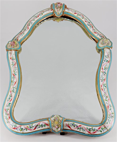 Specchiera d'appoggio con cornice in porcellana decorata in policromia a nastro con fiori e bordura azzurra ed elementi a fiori in rilievo. Profili in oro. Inizio secolo XX (cm 60x46) (difetti e rotture)