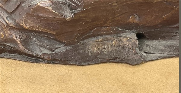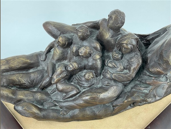 Lotto composto da una scultura multiplo in bronzo di Angelo Maineri intitolata "L'onda della speranza" raffigurante mano con figure (cm 33x19x19) con base separata e un bassorilievo in metallo dorato (h cm 27) su base in legno, firmato Licia