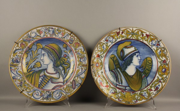 Coppia di piatti in ceramica a lustro raff. ''PERSONAGGI''. Gualdo Tadino....