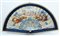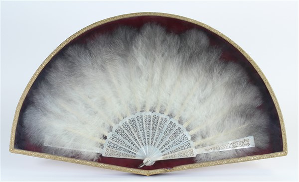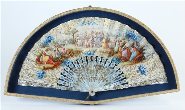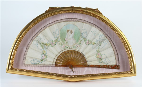 Lotto composto da tre ventagli di cui uno con stecche in madreperla traforata e piume, uno con stecche in madreperla incisa e dorata ed uno con stecche in ambra traforata. Pagine in carta stampata e colorata con scena allegorica, e pergamena dipinta con ritratto femminile e monogramma VV fra nodi d'amore. Epoche differenti, teche in tessuto e legno (difetti)