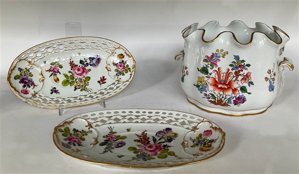 Manifattura Richard Ginori. Rinfrescatoio biansato a bordo mosso in porcellana profilata in oro e decorata in policromia ''al tulipano" (h. cm 16,5; d. cm 21) unito ad una coppia di vassoi di forma ovale in porcellana profilata in oro a bordo traforato, decorati in policromia a fiori di diversa manifattura (cm 26,5x15,5) (difetti e restauri)