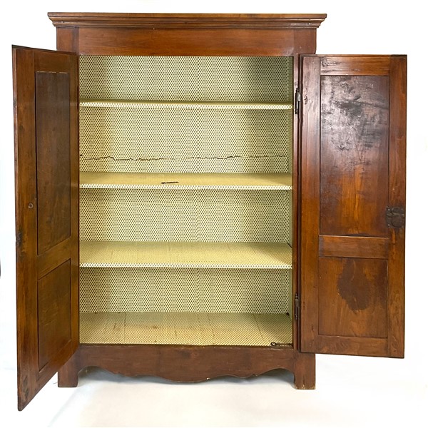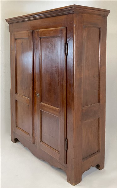 Armadio in legni vari a due ante pannellate e grembiale sagomato (cm 135x175x50