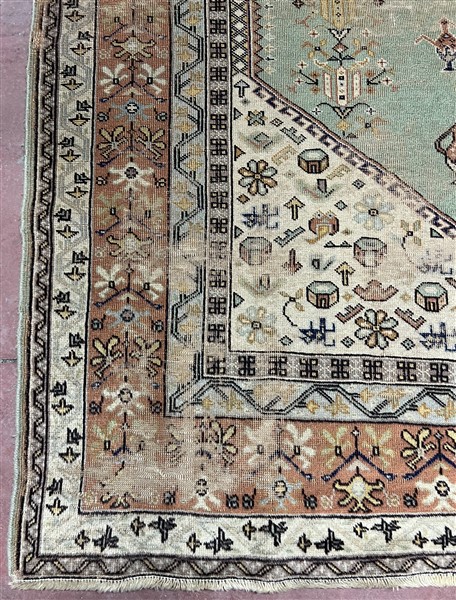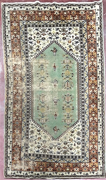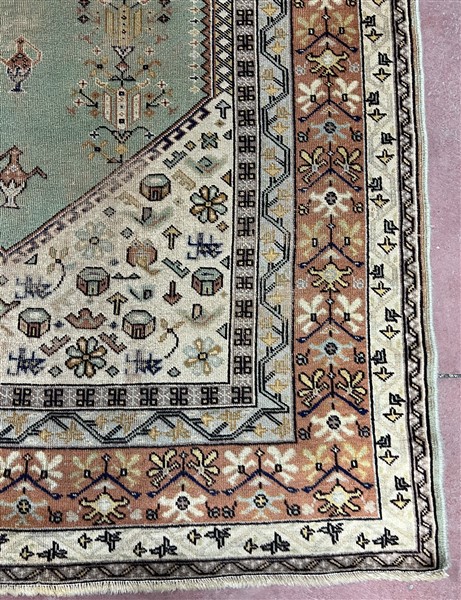 Tappeto anatolico, inizio secolo XX. Medaglione a fondo verde con acquamanili e