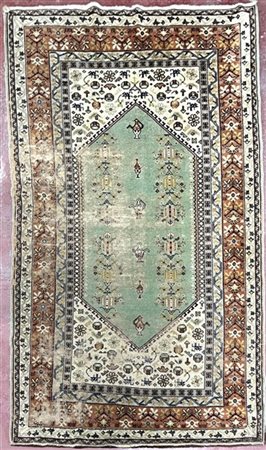 Tappeto anatolico, inizio secolo XX. Medaglione a fondo verde con acquamanili e rami fioriti (cm 245x145) (difetti e rapature)